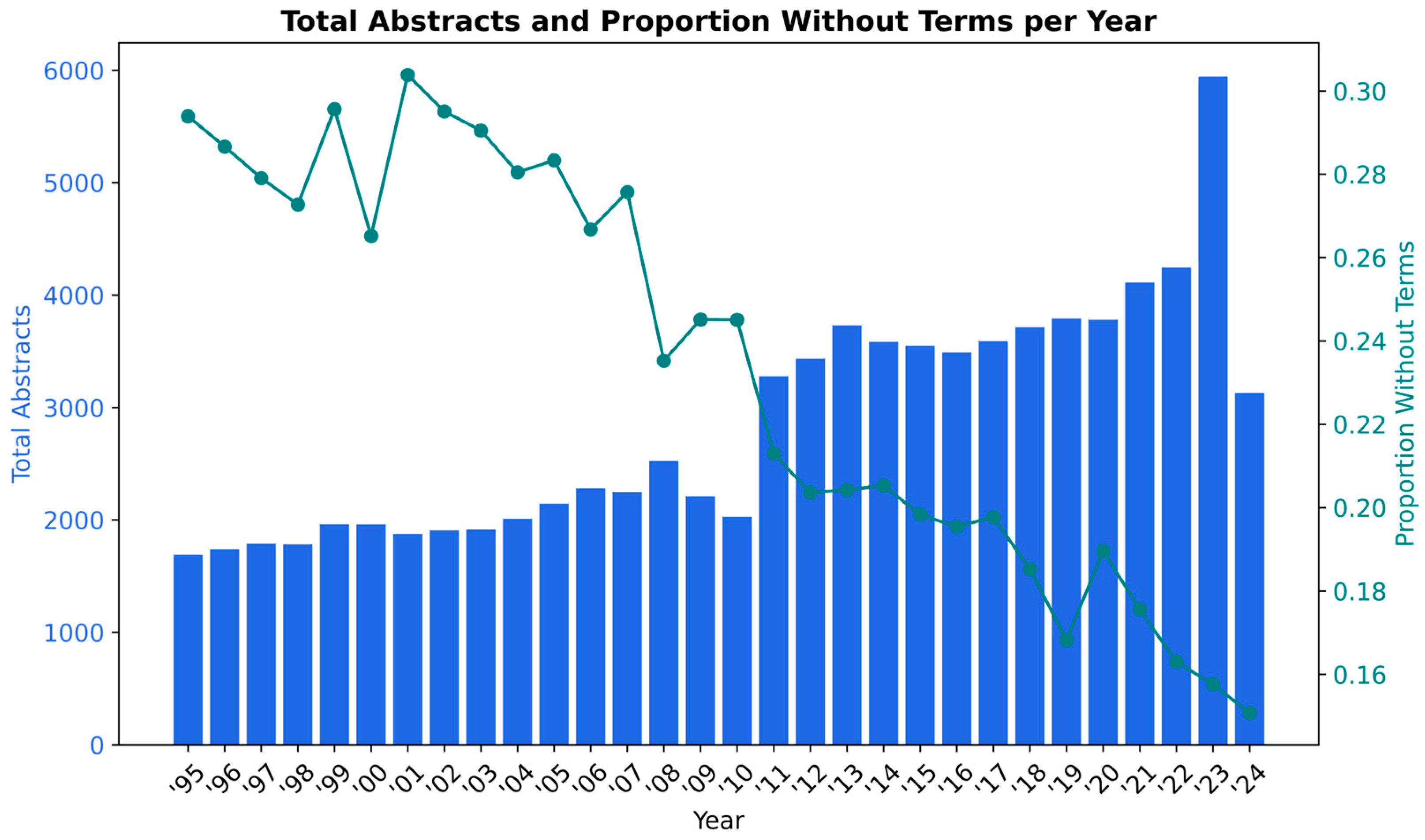 Finally, a trend analysis was conducted to explore temporal variations in term occurrences. Specifically, we analyzed the proportion of abstracts without term presence for each year, calculated as the annual number of abstracts without terms divided by the total number of abstracts for that year.