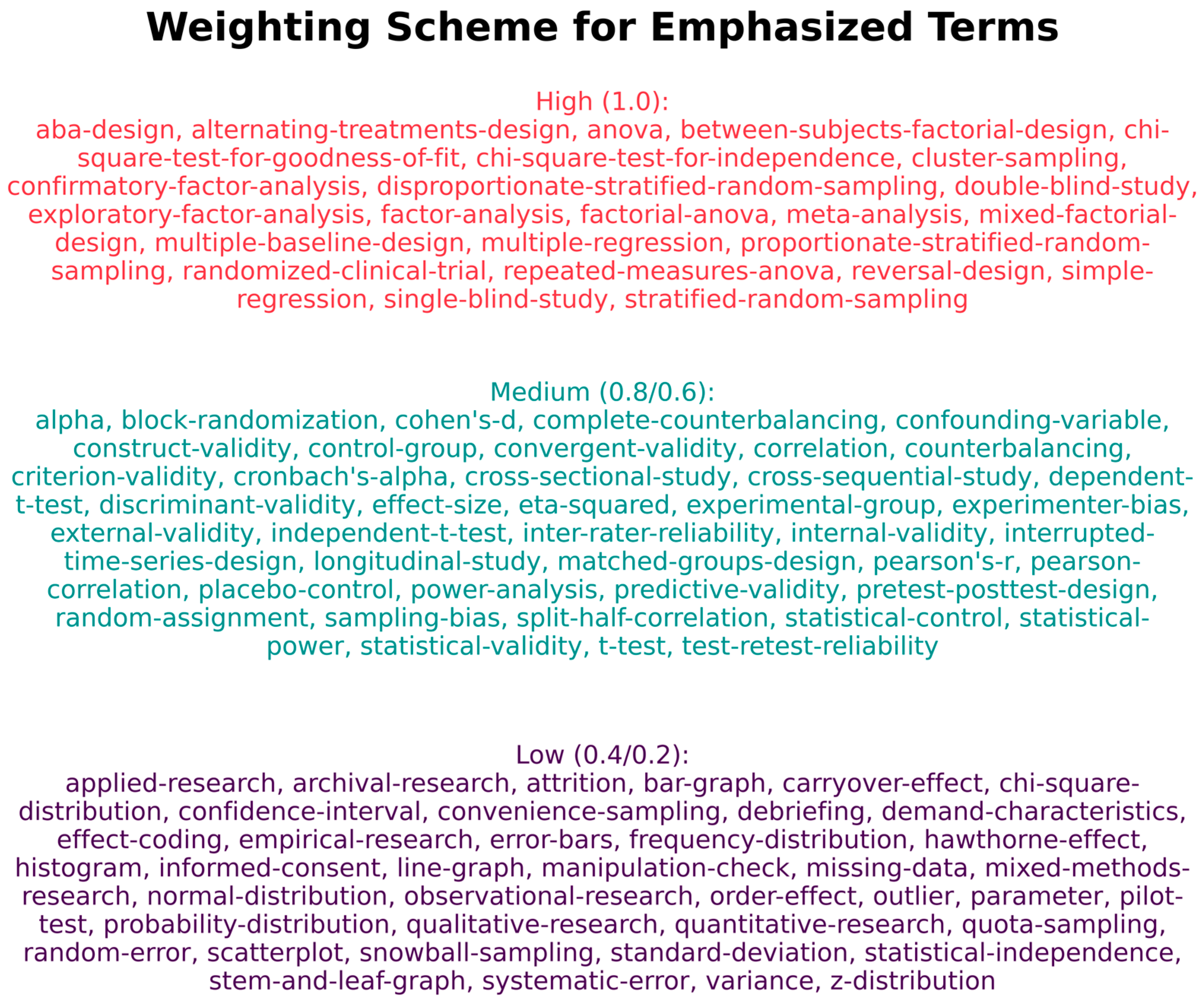 In addition to the unsupervised clustering approach utilized in this study, a weighted technique was explored to potentially enhance the clustering outcomes. For this purpose, a weighting scheme was developed, assigning varying weights to the glossary terms. The goal of this weighting approach was to guide the clustering algorithm in emphasizing key concepts with high theoretical discriminative value.