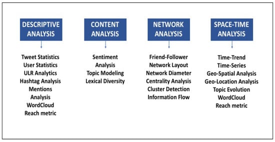 Considering the different techniques used for social media data, Ref. [] proposed a framework composed of three types of analysis to extract information from tweets. These were descriptive, content, and network analysis. In further developing this framework, Ref. [] proposed adding geospatial or space-time analysis, which is responsible for mapping public response in a location-based investigation. The techniques mentioned and the corresponding metrics are presented in Figure 1.