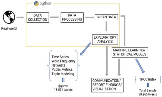 We adopt TPCC because it operationalizes Open Government principles (transparency, participation, collaboration, comfort) in a way that is platform-agnostic yet auditable; adapting it to X extends prior uses centered mainly on Facebook. Five different types of evaluations composed the exploratory analysis for the present research. While the transparency, participation, collaboration, and comfort index [] calculation was the statistical method applied. All results were then summarized, analyzed, and presented using data visualization techniques following this study’s methodology, illustrated in Figure 2. The study did not employ the proprietary X analytics dashboard. We conduct social media analytics on Python 3.10.