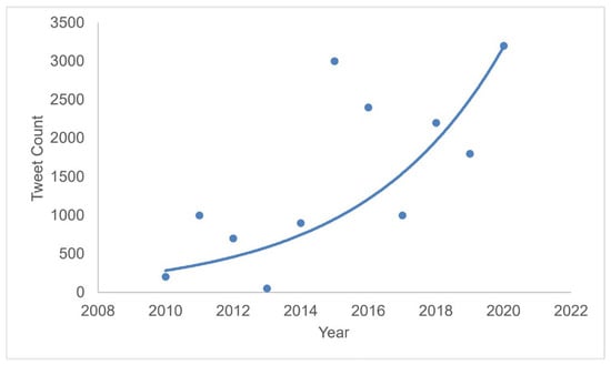 The selected approach to visualize this time series analysis was the regression line, considering the intent was to establish the trend, that is, the relationship between two variables: time (in years) and the number of posts. The year of each publication could be isolated through the “created_at” field of the tweet’s object in DateTime. Subsequently, all tweets were grouped by year of creation and counted. The results were then prepared for visualization on a regression line using Matplotlib [].