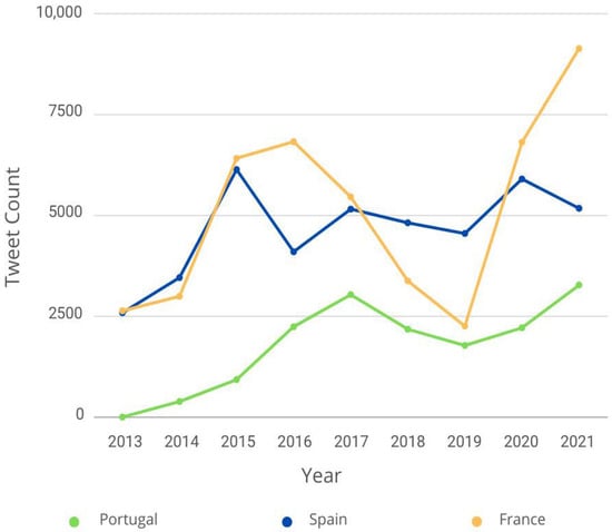 A persistent digital divide problem in Portugal [] has led the country to adopt a traditional approach to public administration. In addition, the low adhesion of Portuguese people to modernization efforts, combined with widespread political participation, aggravates the current state of social media []. These facts exemplify the estimate that 8.5 million people (83.8% of the total population) were active on social networks in Portugal in January 2022 []. Notably, only 2.6% (207,500) of these individuals followed the official government page on X, and 1.6% (130,430) on Facebook. As a light benchmark, contrasts tweet volumes with Spain (@desdelamoncloa) and France (@gouvernementFR); Portugal shows lower activity pre-2016 and a pandemic-era surge consistent with peers.