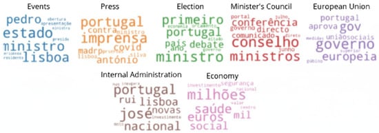 After the preprocessing techniques were performed, two fields were added to the original Dataframe: “clean_tokens”, consisting of the remaining words split into individual elements, and “clean_tweet”, where the clean text was kept in its string form. Since different analyses require different forms of preprocessing, the data were split into two different datasets to perform the exploratory analysis on the @govpt’s data only (18,071 tweets). A complete dataset, composed of all the accounts, was used for the TPCC Index measurements.