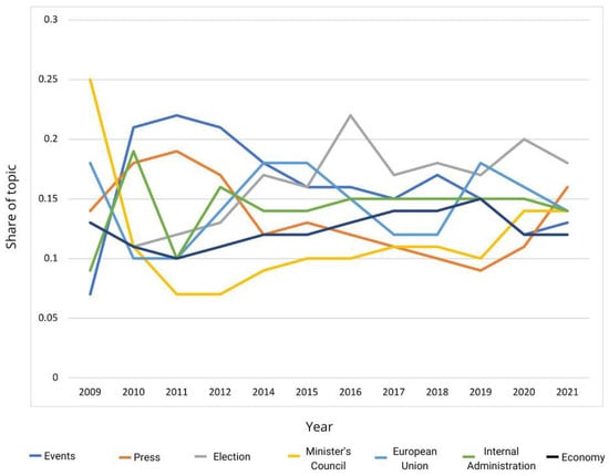 We conducted a descriptive and exploratory analysis (EDA) on @govpt to characterize longitudinal patterns and guide the subsequent TPCC evaluation. The TPCC computations then use the full 14-account dataset []. It aggregates methods for primary analysis that can detect mistakes, check assumptions, determine the relationship between variables, and enable the correct selection of models and techniques for later use. We focused the EDA on @govpt to avoid over-weighting accounts with disparate lifespans/volumes and to keep the descriptive overview concise; all inferential classification (TPCC) uses the complete dataset. For this objective, the techniques employed were time series, public metrics, and topic modeling. Sentiment classification was intentionally excluded due to known challenges in Portuguese governmental communication, such as domain-specific vocabulary, irony and sarcasm, and politicized lexicons. This decision ensured methodological rigor and interpretability. Instead, we prioritized auditable, structure-based indicators (TPCC).