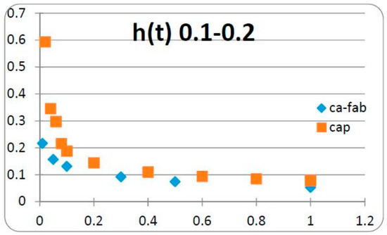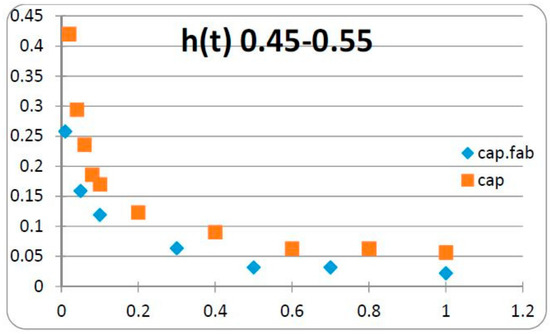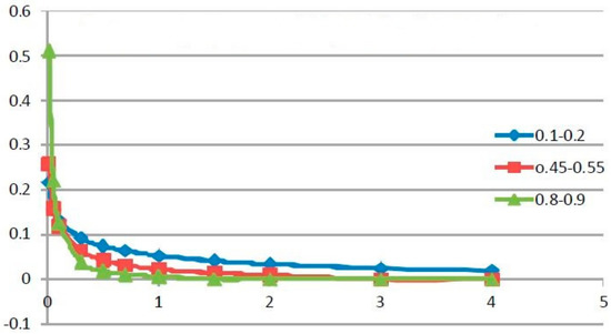 In the 3 cases considered and illustrated in Figure 3, Figure 4 and Figure 5, the values of the kernels of the Caputo DOFD and of the Caputo-Fabrizio DOFD are compared. These values decrease monotonically by less than 0.1 at unit time; however, the Caputo DOFD diverges at t = 0, while the Caputo-Fabrizio DOFD is initially bounded, which has obvious implications, which need to be taken into account when selecting the most appropriate fractional derivative for the problem under consideration. So, when the fractional derivative is substituted by a distributed-order derivative, we may obtain the constitutive equation of a material with new properties compared to those given by the singular components.
