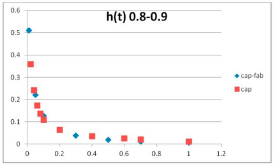 Comparison of the values of the kernels of the Caputo DOFD and the Caputo-Fabrizio DOFD when the order is distributed in the interval of integration 0.8–0.9.