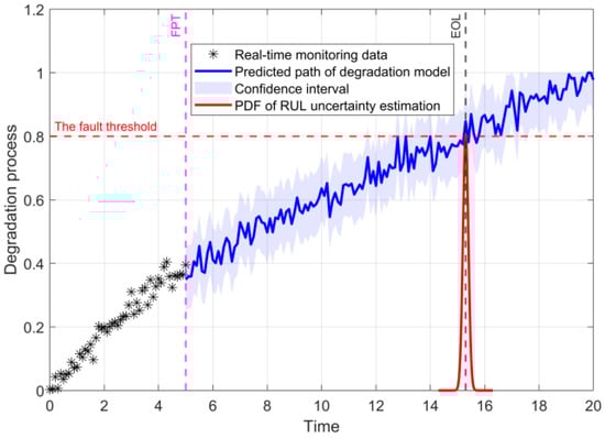 where is the time of the degradation process, is the process time of RUL, is the FPT, and is the set fault threshold.