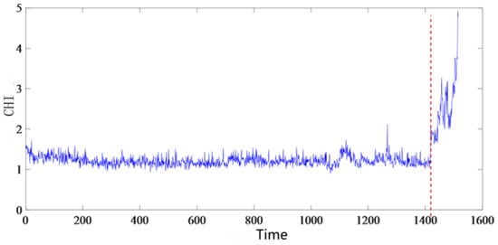 It should provide a concise and precise description of the experimental results, their interpretation, as well as the experimental conclusions that can be drawn. When the rolling bearing is operating normally, the degradation sequence exhibits the characteristics of a stationary random sequence. Once a weak fault occurs, the characteristics of the degradation sequence will change from a stationary random sequence to a non-stationary random sequence. Figure 7 shows that there is an obvious fluctuation at the 1418th point. After this point, the characteristic values of the degradation process suddenly change significantly and fluctuate violently. This stage is considered to be the slow failure stage of the rolling bearing; see Figure 7.