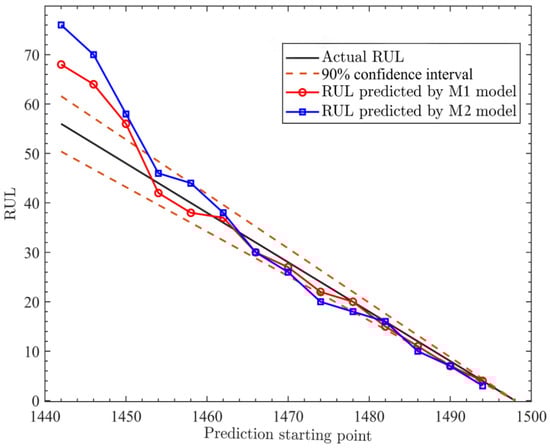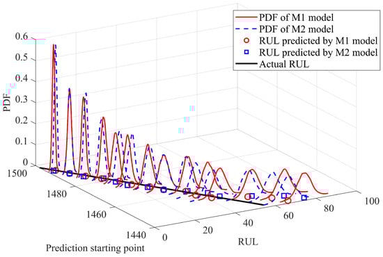 Let us refer to the exponential drift of the fGPm. Table 1 shows the maximum likelihood parameter identification of the fGPm degradation model at different prediction starting points. Figure 8 shows the RUL prediction results of the fGPm model (M1) with an adaptive drift function and the fGPm model (M2) without an adaptive drift function at multiple starting points. Figure 9 shows the uncertainty estimation results of M1 and M2 models at different prediction starting points. The analysis results indicate that an adaptive drift term can significantly improve the accuracy of prediction results.