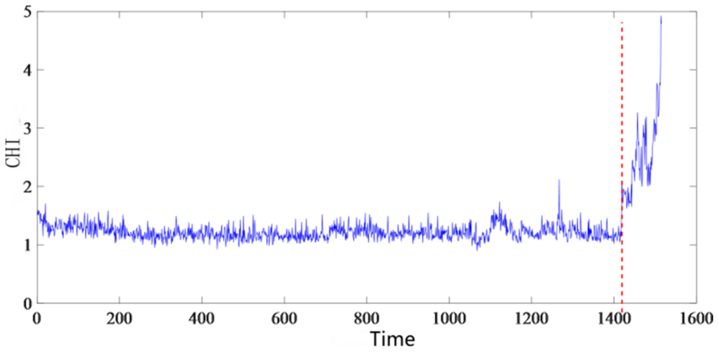 - Degradation trendiness: Represents the correlation between degenerative characteristic and time series, calculated as follows:where , and is the th value of the time series. A greater the value of the trendiness corresponds to a better fit.