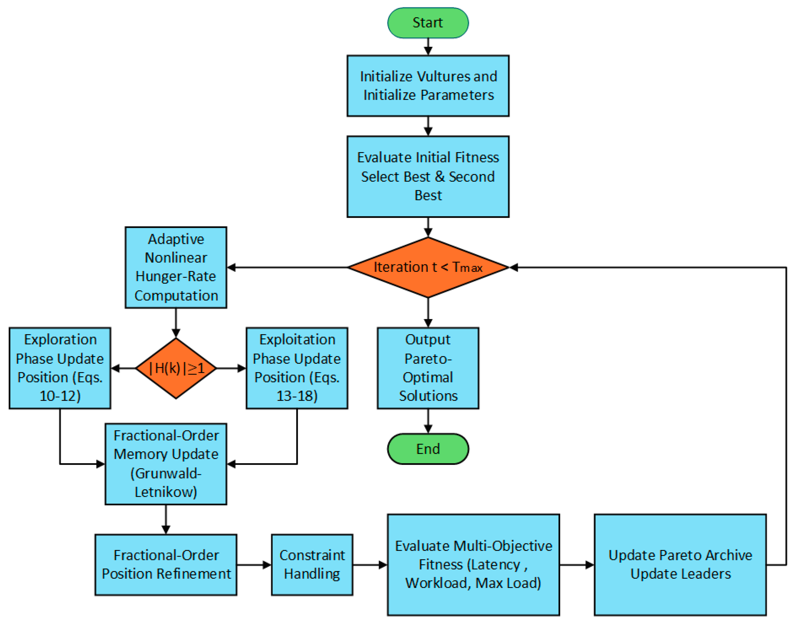 To address these challenges, this paper proposes an FO-MO-AVOA for efficient and intelligent dynamic edge-server allocation. The proposed algorithm is inspired by the cooperative foraging, navigational intelligence, and hierarchical leadership behaviours of African vultures. It integrates a nonlinear hunger-rate control mechanism and an adaptive Lévy-flight exploitation strategy to dynamically balance global search and local refinement. In addition, a multi-objective optimization framework is formulated to simultaneously minimize service latency and deployment cost while satisfying user delay requirements and system constraints. Fractional calculus is incorporated into MO-AVOA to introduce long-memory effects into the optimization process. Unlike integer-order updates that depend solely on the current iteration, fractional-order dynamics allow the search process to retain information from past states, leading to smoother convergence trajectories and improved stability. This memory-aware behaviour is particularly beneficial in dynamic MEC environments, where historical workload patterns can provide valuable guidance for future edge-server allocation decisions.