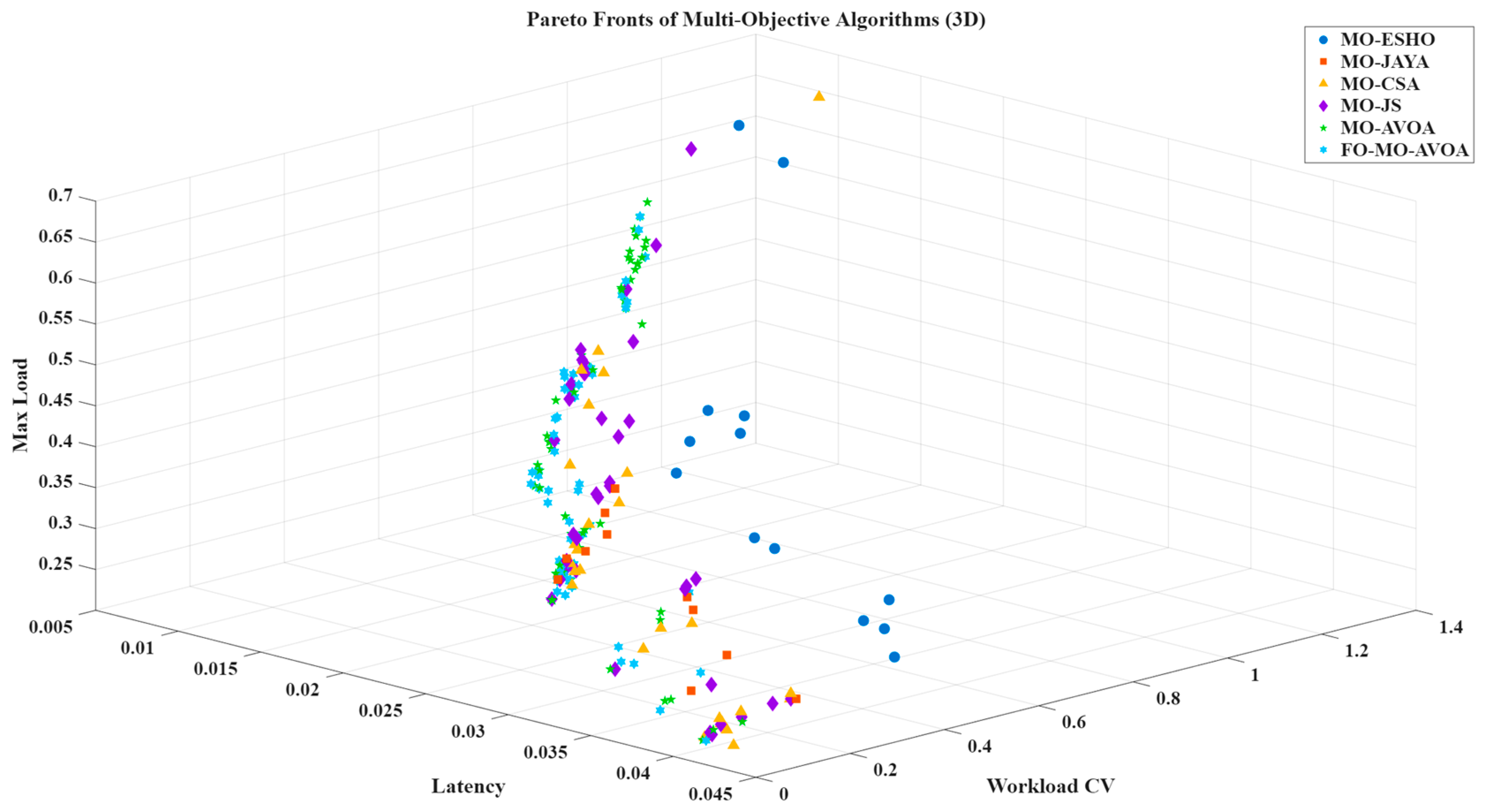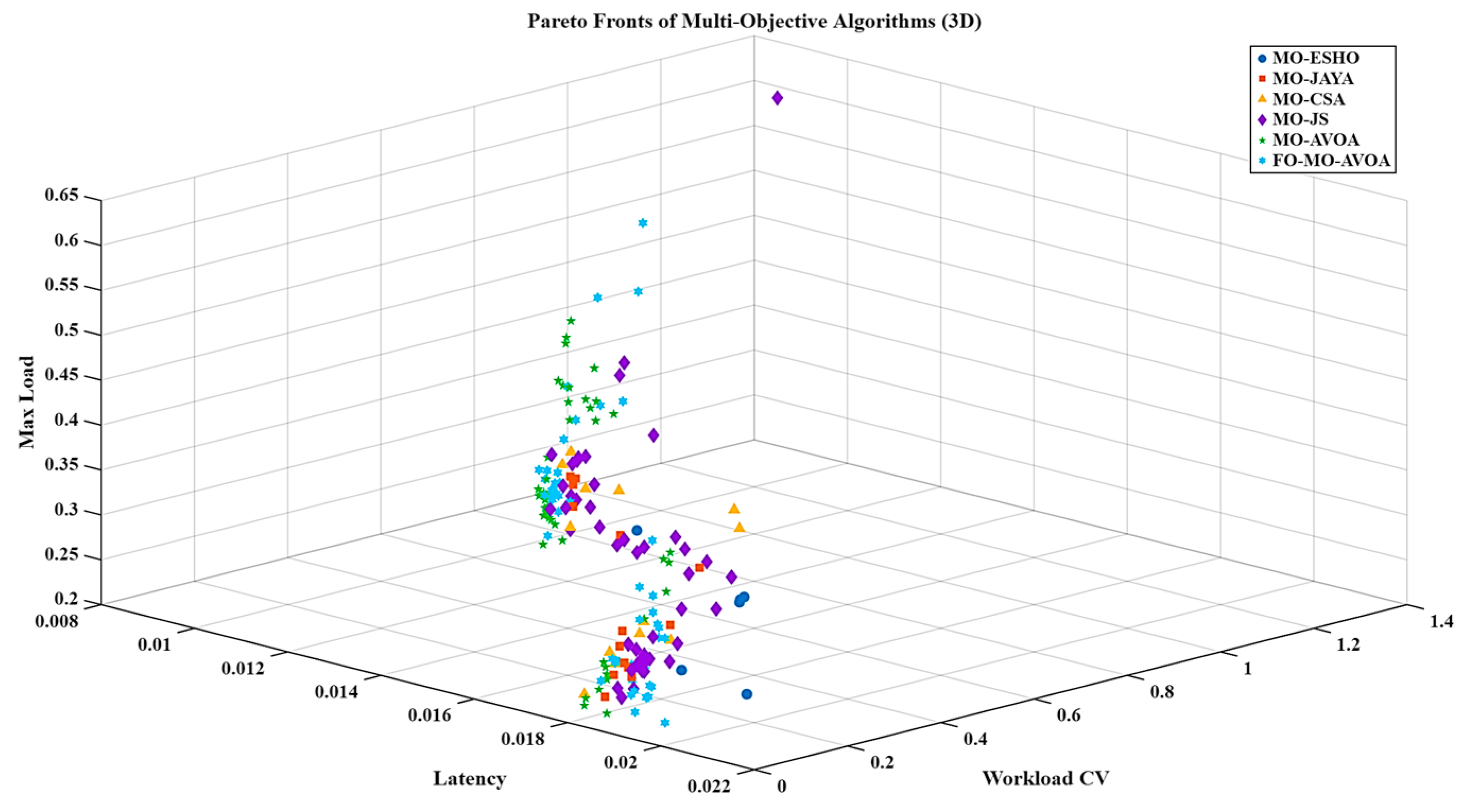 | FO-MO-AVOA | 0.0208 | 0.3822 | 0.2523 | Lowest latency value—balance between latency and workload; lowest Maximum workload value and most stable Pareto front |