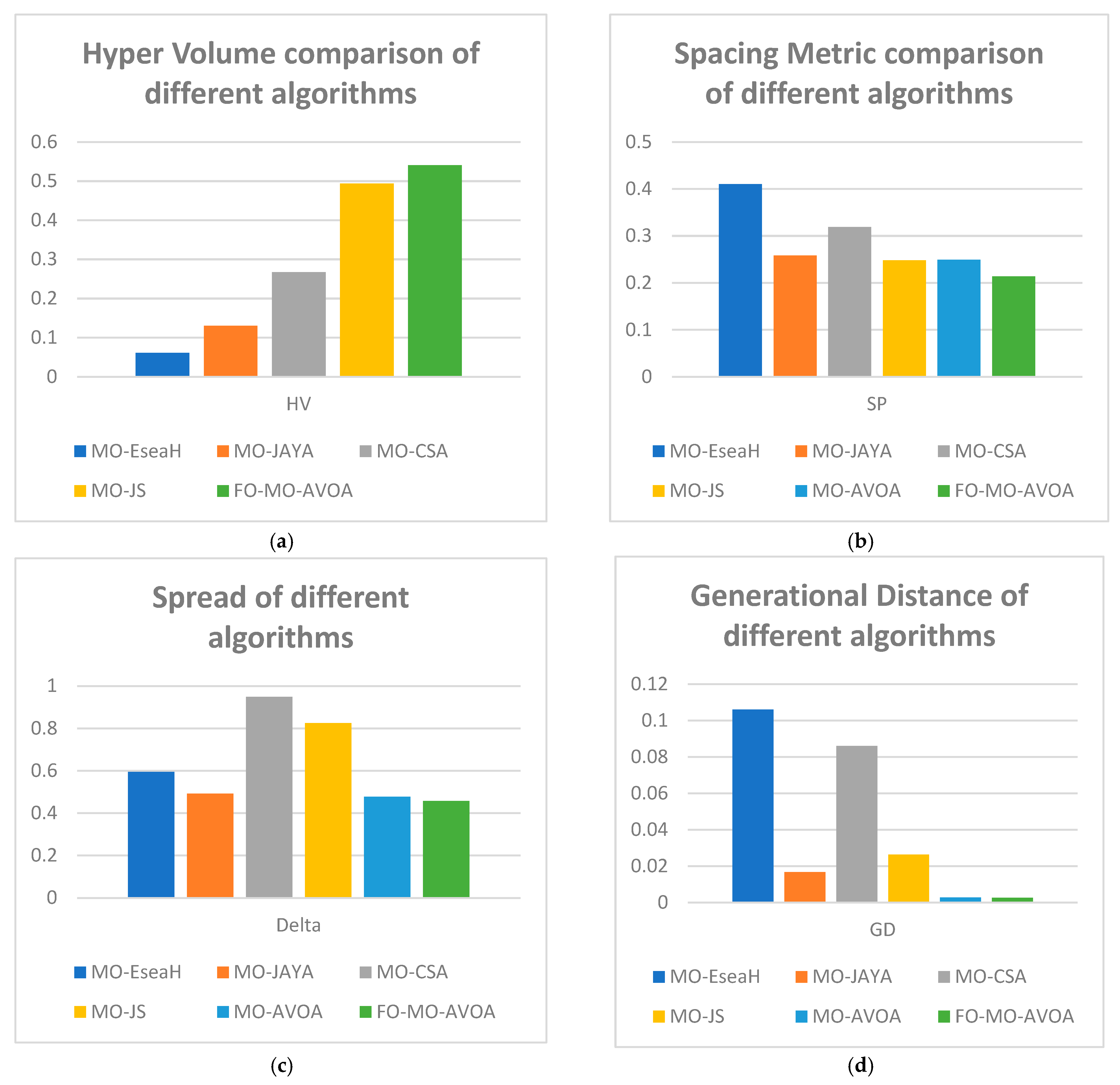 (a) Comparison of Hypervolume, (b) Spacing metrics, (c) Delta, and (d) GD against different Algorithms (Case 3).