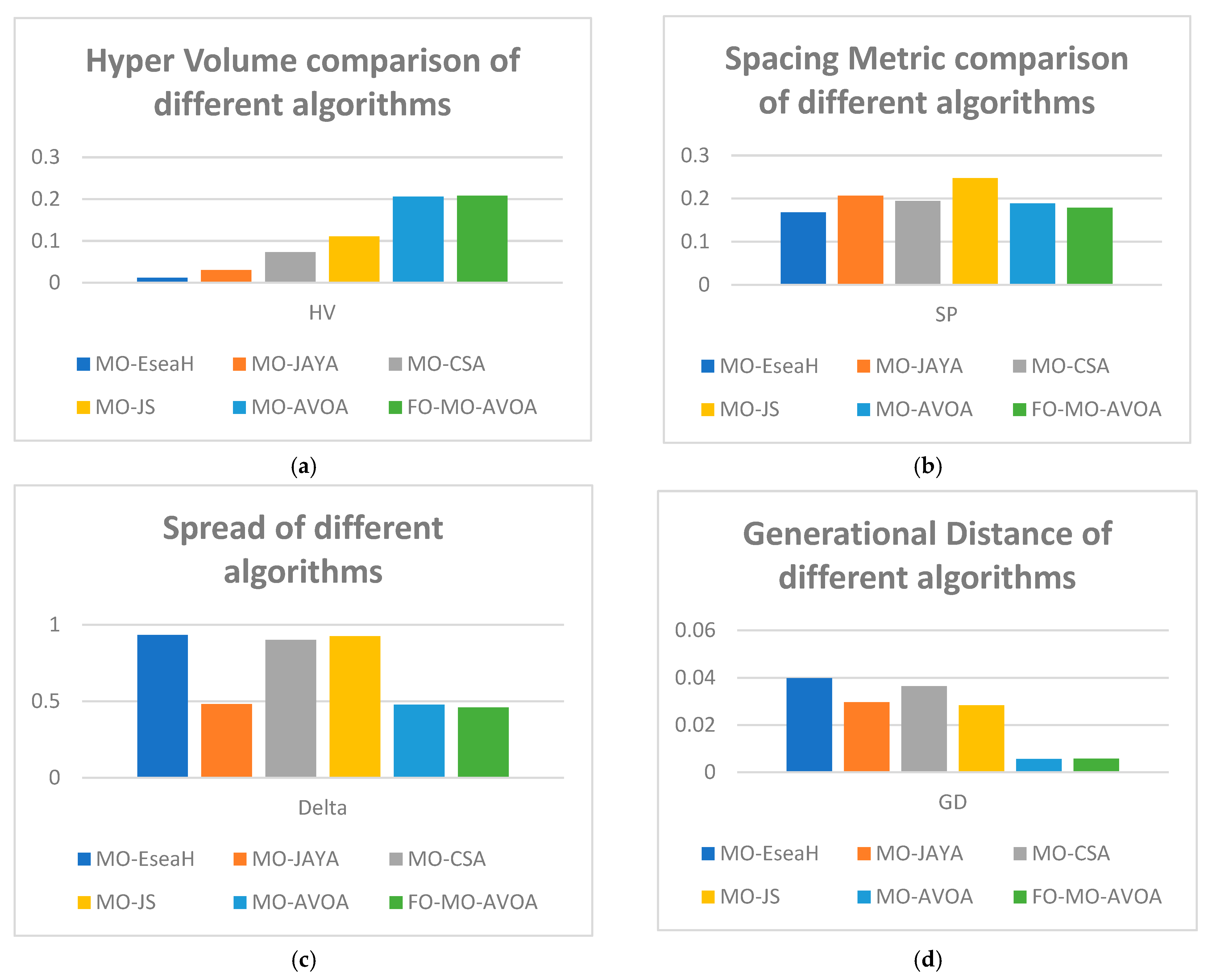 | MO-AVOA | 0.019–0.024 | 0.38–0.84 | 0.25–0.38 | Strong Pareto spread; multi-objective compromise |