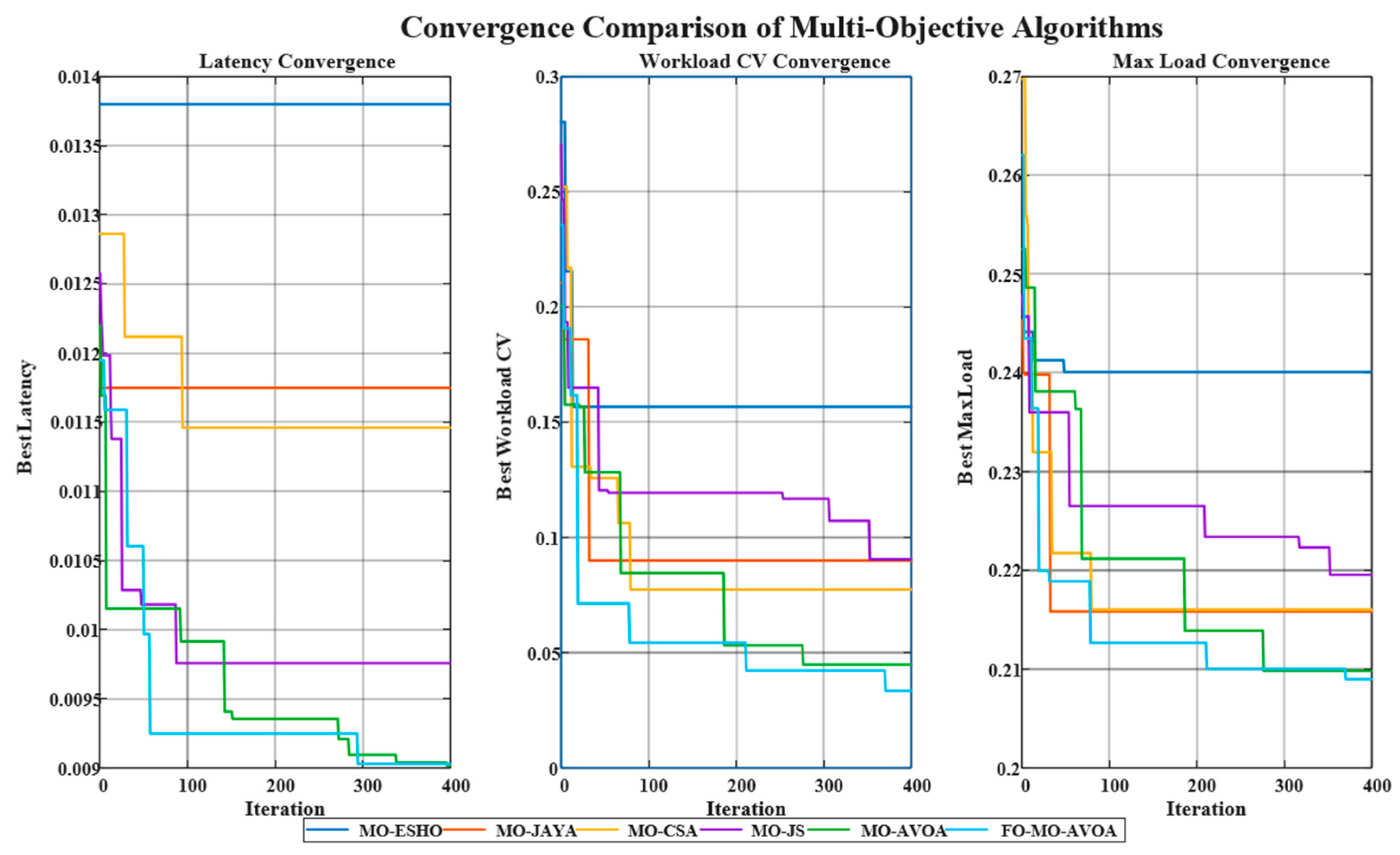 | FO-MO-AVOA | 0.008–0.011 | 0.04–0.24 | 0.209–0.25 | Strongest overall compromise—lowest max-load, well-balanced workload, and stable latency under heavy network load. |