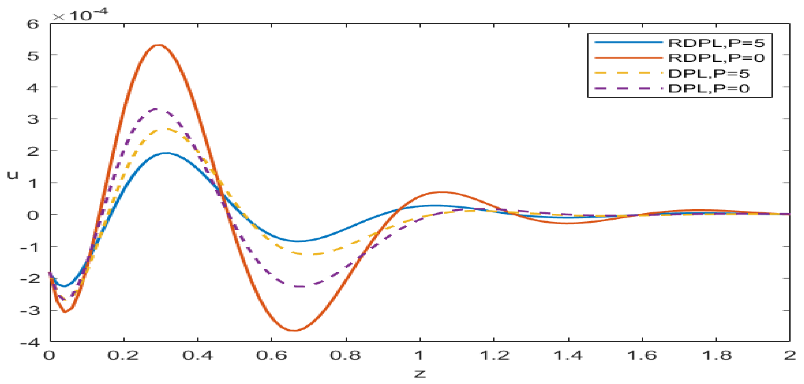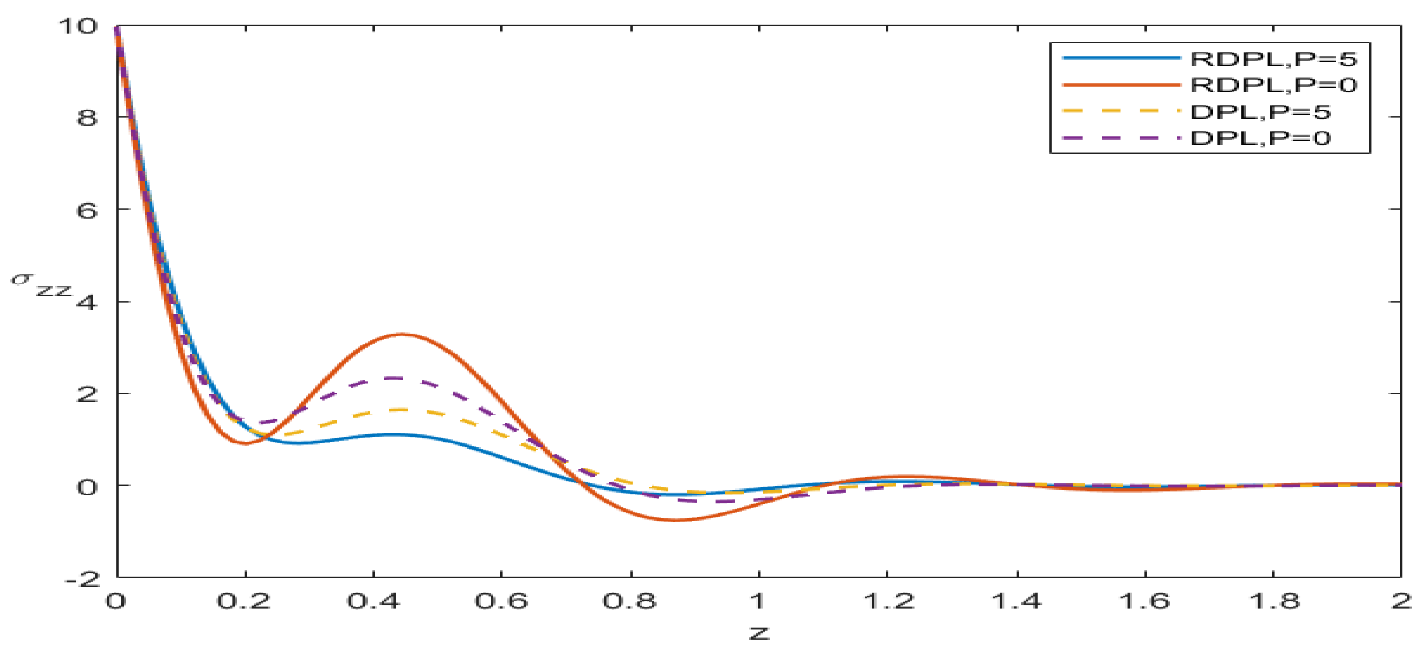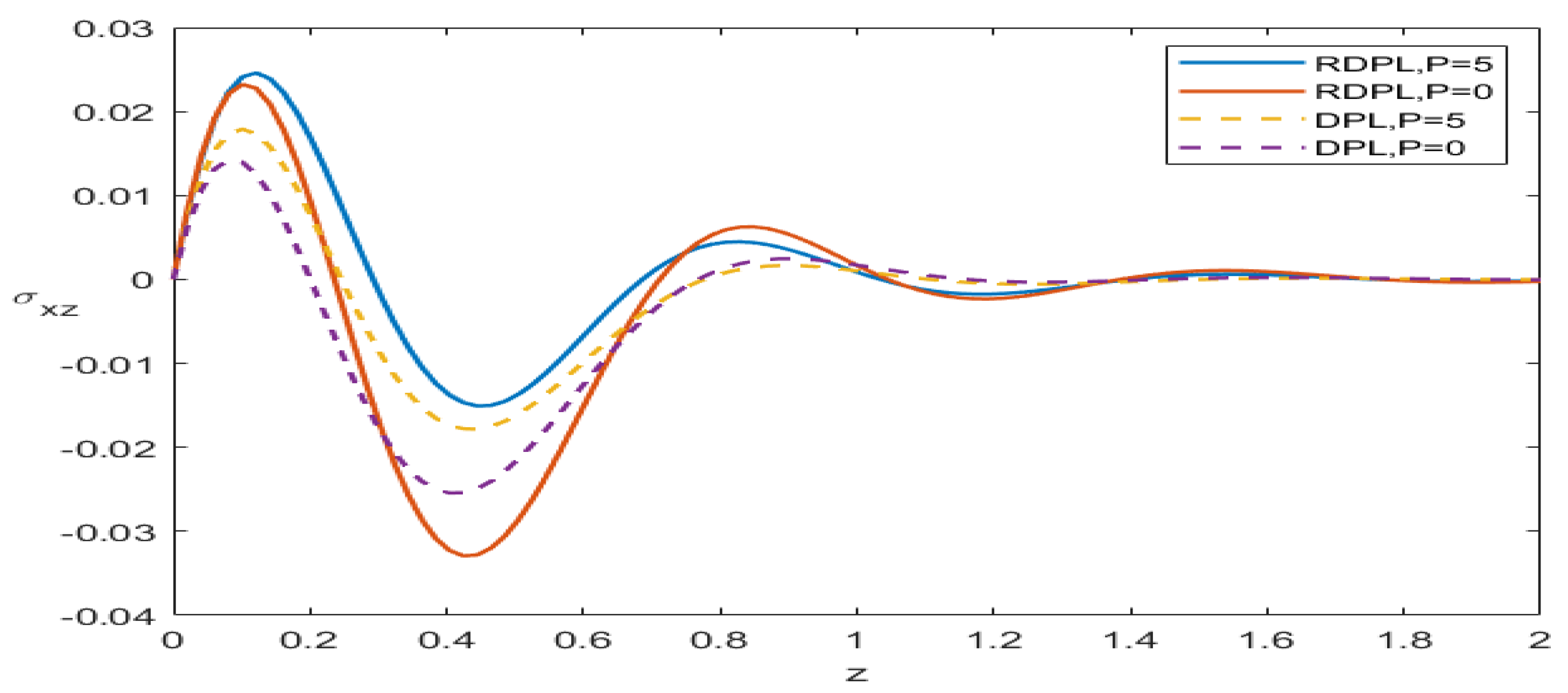P has a noticeable effect on the propagation of the displacement wave. The RDPL model exhibits a smoother and more stable wave profile compared to the DPL model due to its enhanced ability to represent finite thermal relaxation and lagging effects. The presence of initial stress increases the material stiffness, resulting in changes to wave amplitude and propagation speed. The RDPL curve demonstrates reduced wave attenuation and more realistic dynamic behavior, highlighting the improved predictive capability of the refined model.