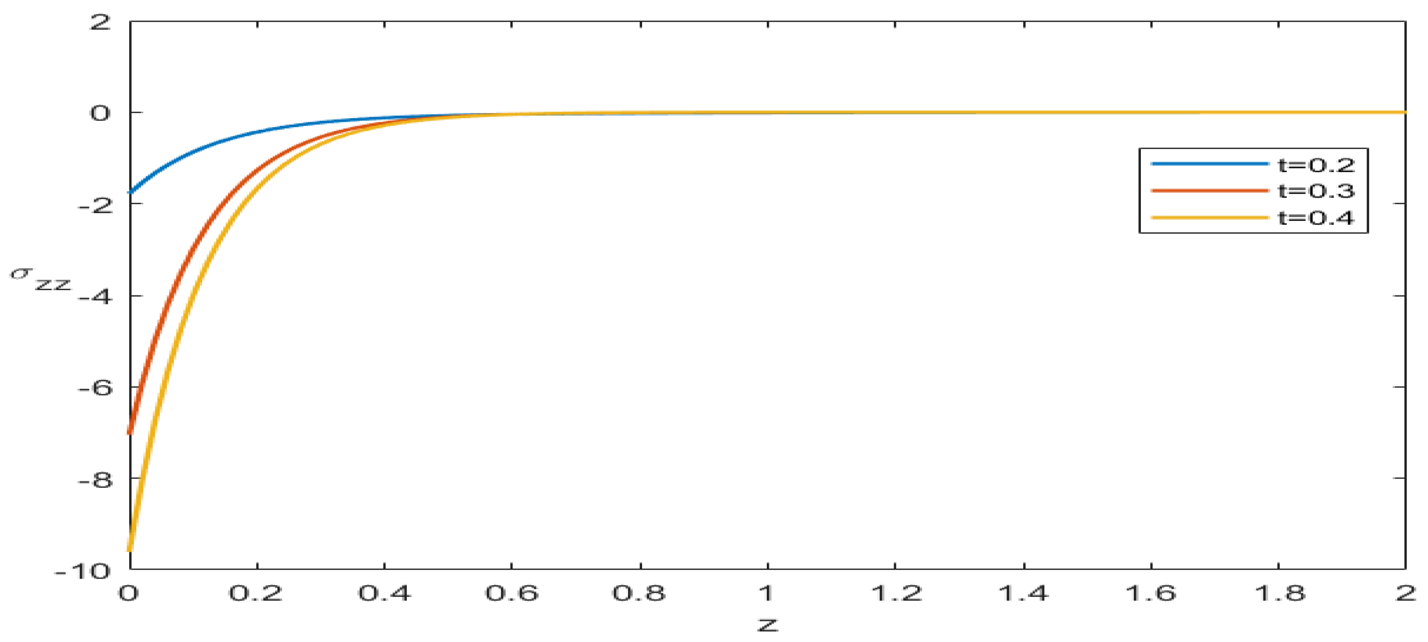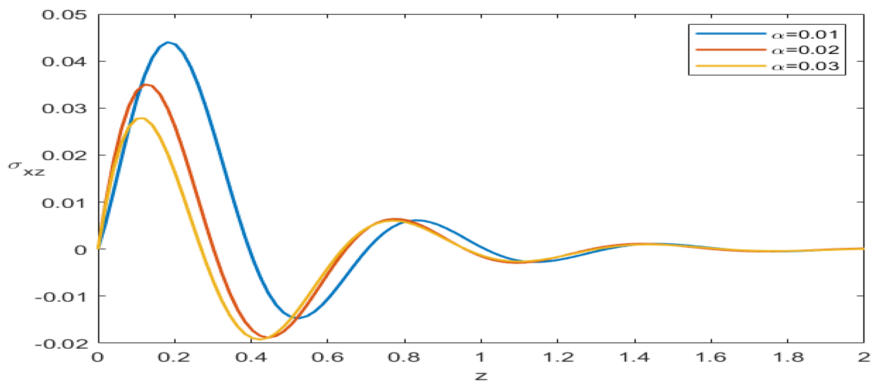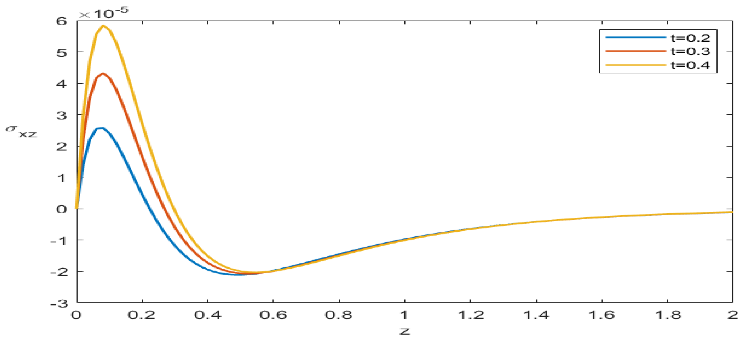 , where smaller values of the fractional parameter lead to stronger damping and smoother stress variation. This demonstrates that fractional effects significantly influence the stress transmission mechanism, reducing stress gradients and enhancing material stability. The physical sensitivity of the system to the fractional parameter