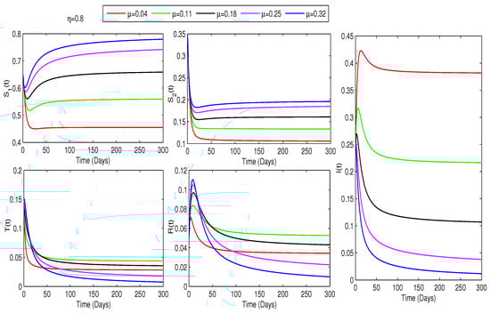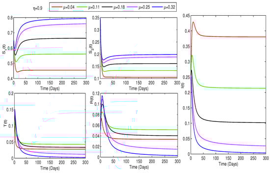 Thus, each state variable follows the same iterative structure, with the function determining the system (7) dynamics. Using the scheme (18), we evaluate the effect of a uniform treatment strategy at varying coverage levels. A detailed discretization of the Toufik–Atangana numerical scheme for the equation of type (7) is given in [42,49].