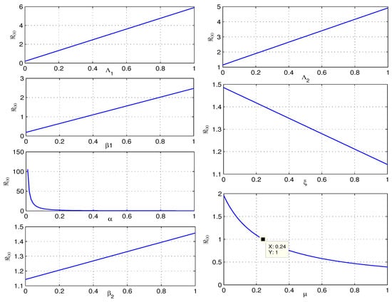which is clear greater than . Consequently, . This implies that the expression given in (15) is a Hurwitz polynomial. Hence, by Routh–Hurwitz criterion, the eigenvalues of the polynomial (15) are negative. Thus, the point of system (7) is LAS, which completes the proof. Once the dynamical system (7) achieves stability at , the Coronavirus will remain in individuals, validating the claim. □