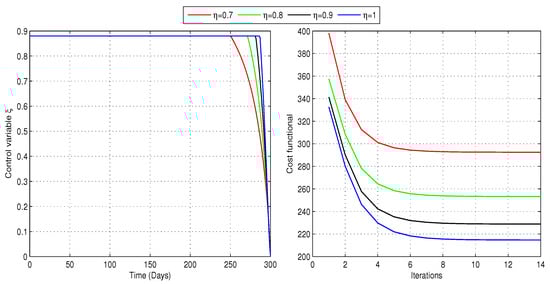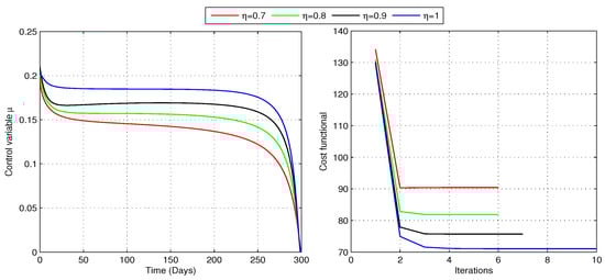 To determine the optimal treatment rate for problem (24), we analyze the cost functional (23) with and , while maintaining a constant awareness rate . The non-zero weighting coefficients reflect the relative importance of disease burden and treatment expenses, with a higher value of placing more emphasis on reducing the number of individuals in the I compartment. As illustrated in Figure 9, the optimizer and the cost functional vary across different fractional orders. The iteration counts for the optimal controls and the associated implementation costs are described in Table 3. The results suggest that during the initial stage of the pandemic, approximately 15–21% of infected individuals require treatment, after which the percentage gradually declines. The optimal treatment control minimizes the cost functional for each fractional order, achieving the lowest overall cost at . Table 3 highlights that computations require more iterations as increases. This optimal treatment approach not only decreases the number of infections but also increases the susceptible population for all values of (as shown in Figure 10), signifying its effectiveness in controlling the spread of COVID-19. Additionally, as the number of infectious people declines, the number of people in the treatment class reaches its peak, leading to an increase in recoveries, as shown in Figure 10. Therefore, the strategy successfully decreases the rate of infection and boosts the number of people who recover.