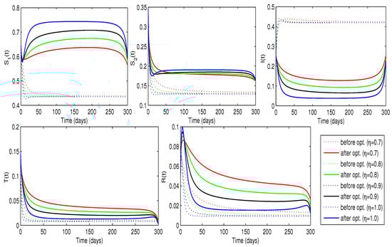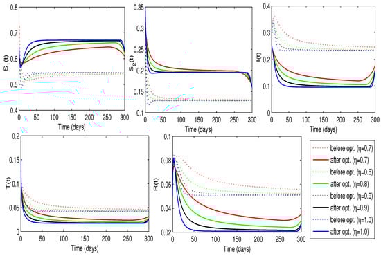 Trajectories of the disease model with and without optimized treatment rate for infected individuals (Case-1).