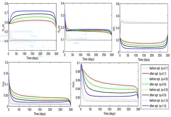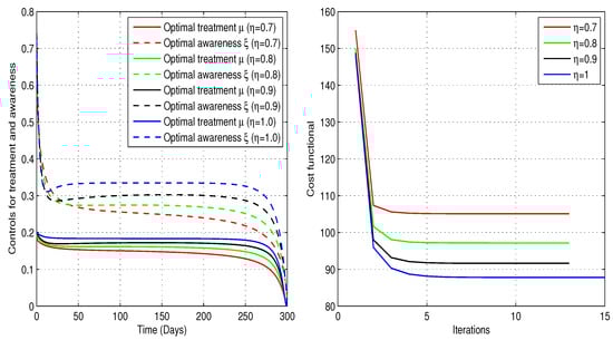 Now, we approximate the optimal treatment rate, , and awareness rate, , that optimize the control problem. By assigning positive values to the weights , the objective is to minimize the number of infected individuals while keeping the overall implementation cost as low as possible. The results, shown in Figure 13, demonstrate that the combined implementation of controls significantly reduces the total cost. We observe a clear need for awareness sessions. Initially, around to of individuals in the group require education at the beginning, but this level of awareness may decline over time. At the same time, only to of the infected individuals require treatment, and this percentage gradually decreases over time. These profiles are illustrated in Table 5. As usual, the smallest minimum cost occurred when . Moreover, implementing both controls simultaneously contributes to reducing the number of infected individuals while increasing the susceptible population, as illustrated in Figure 14.