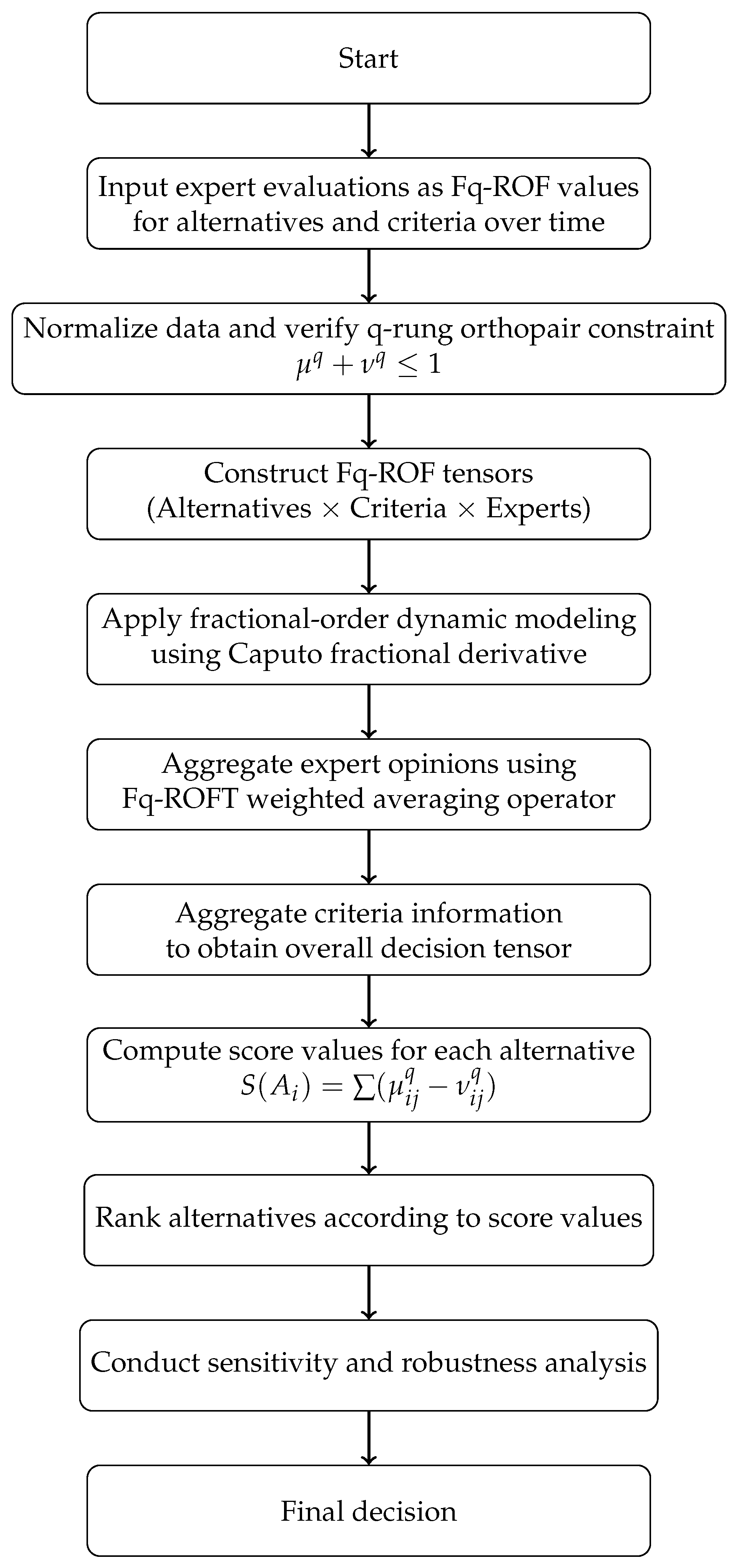 The proposed Fq-ROFT framework addresses these gaps by unifying fuzzy logic, tensor algebra, and fractional-order dynamics into a single, robust, and scalable methodology for dynamic group decision-making.