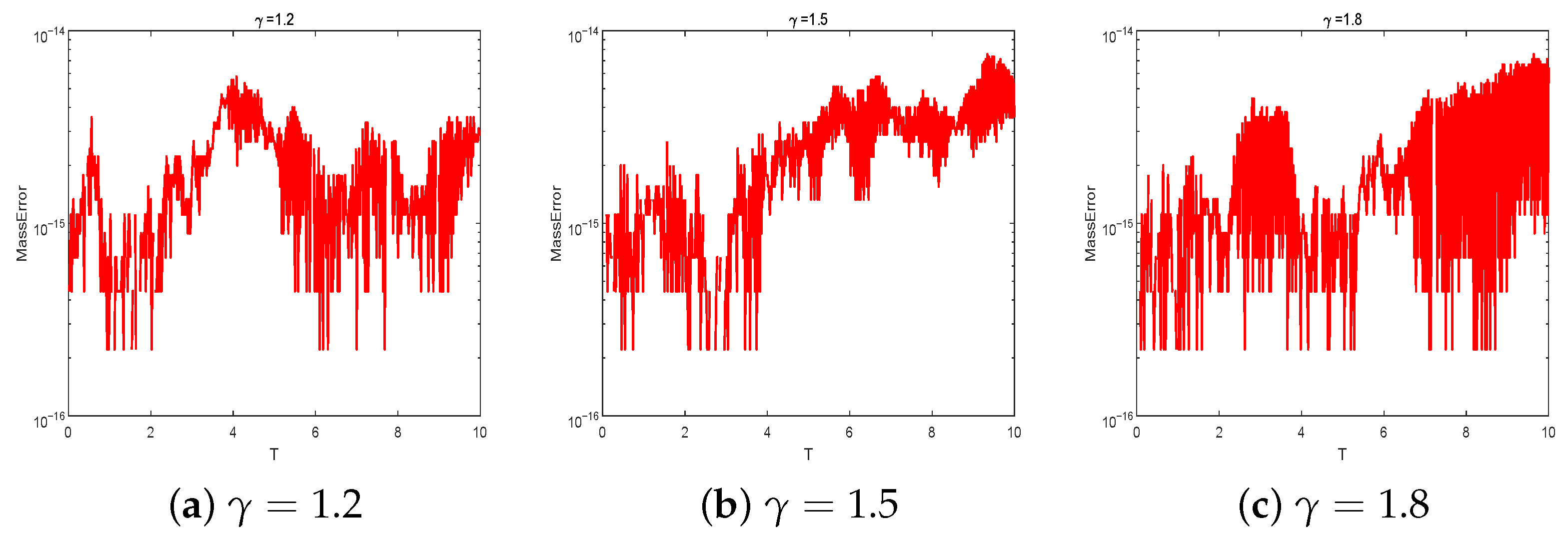 - Zhai, S.; Wang, D.; Weng, Z.; Zhao, X. Error analysis and numerical simulations of Strang splitting method for space fractional nonlinear Schrödinger equation. J. Sci. Comput. 2019, 81, 965–989. [Google Scholar] [CrossRef]