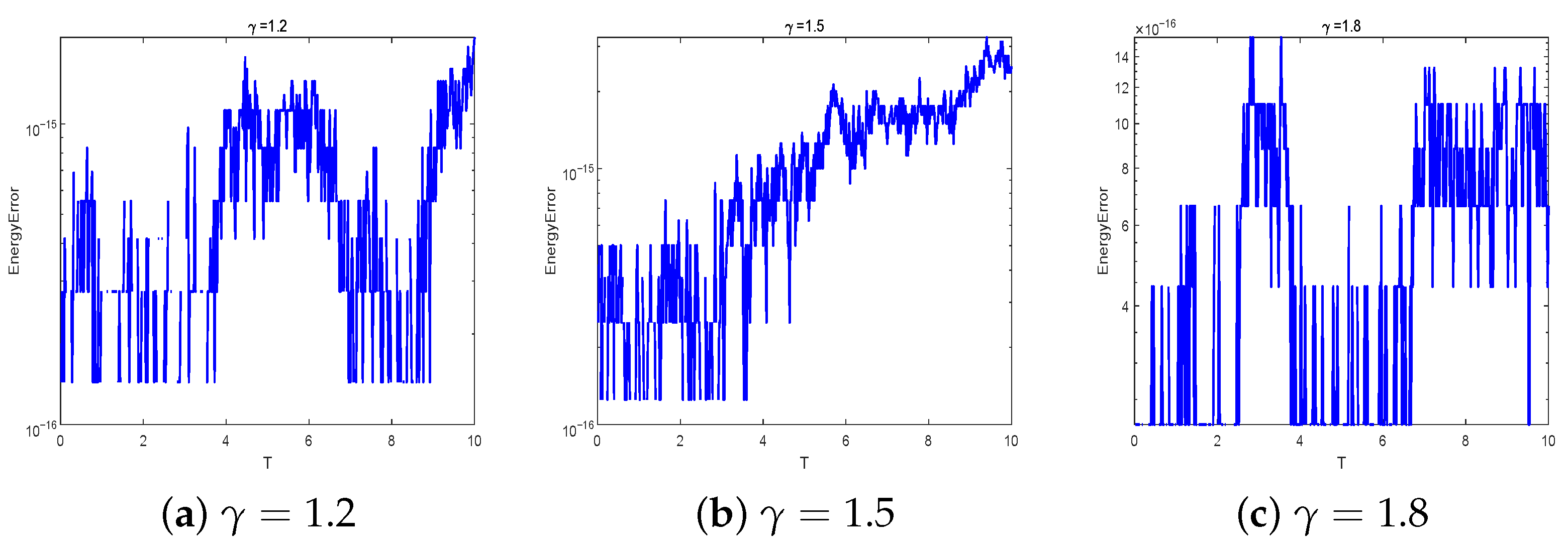 - Liu, Y.; Ran, M. Arbitrarily high-order explicit energy-conserving methods for the generalized nonlinear fractional Schrödinger wave equations. Math. Comput. Simul. 2024, 216, 126–144. [Google Scholar] [CrossRef]