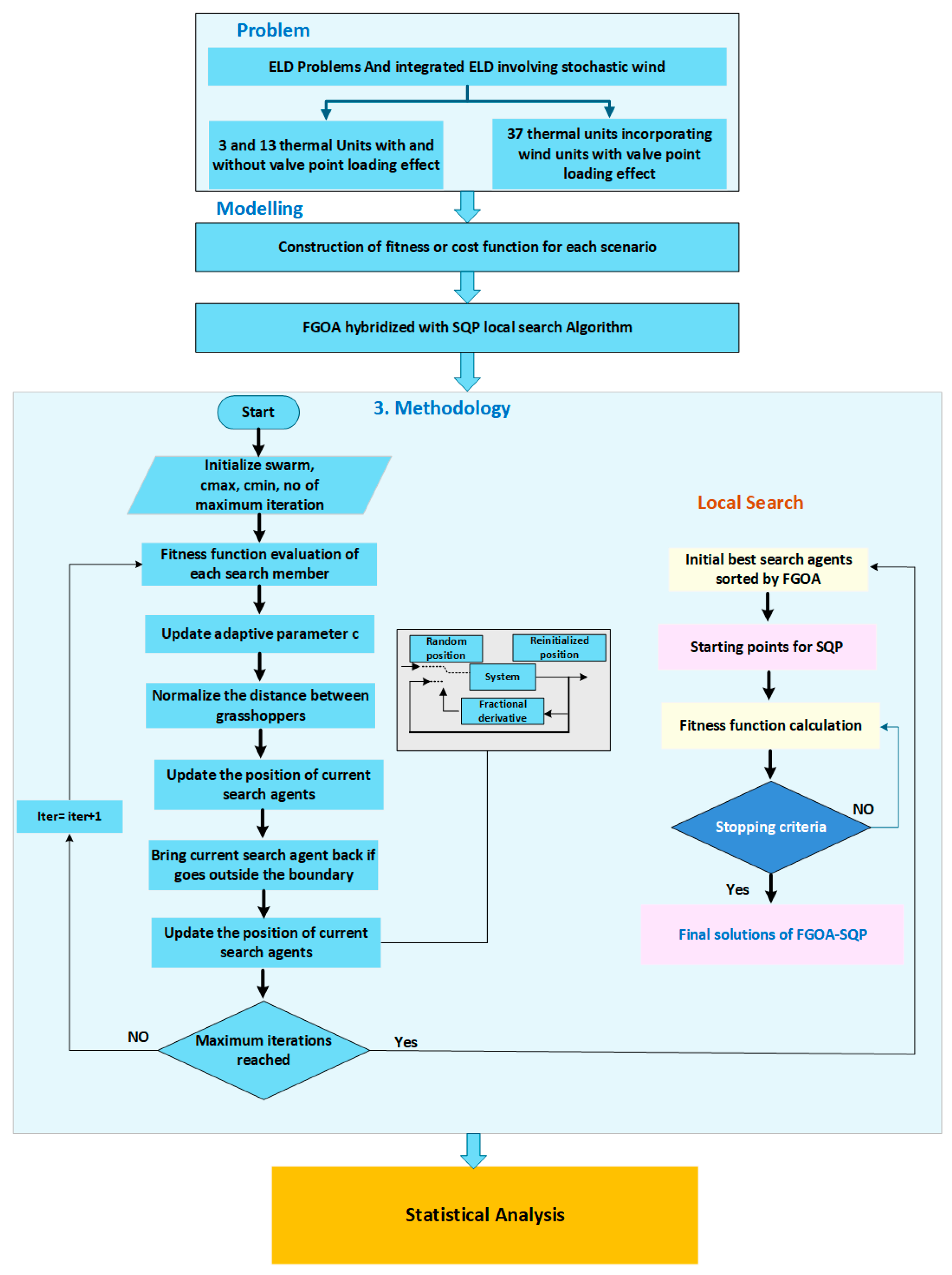 - Distinction from existing hybrid metaheuristic approaches:Contrary to typical classical hybridized metaheuristic approaches, which involve the integration of two different integer-order-based optimization methods or a local search algorithm as a post-processing tool for refinement, the innovative contribution of the proposed FGOA-SQP lies in a novel way of applying a different type of hybridization. Within this manuscript, the application of FC is incorporated at the core motion dynamics of the proposed GOA in a way that goes beyond the mere auxiliary role of facilitating supplementary search refinement. By doing so, the optimizer is capable of incorporating the effects of memory and long-range dependencies in search path behavior, which play a significantly important role in shaping the search path over multiple iterations. Additionally, the hybridized algorithm with SQP is applied in a tightly integrated manner, in which the globally optimal result derived from the proposed FGOA is used for initializing SQP. Hence, unlike classical methods, which involve using local solvers in an independent manner, the proposed FGOA-SQP provides a better-balanced exploration and exploitation capability with guaranteed faster convergence and improved solution quality for nonlinear and nonconvex wind-integrated ELD problems.