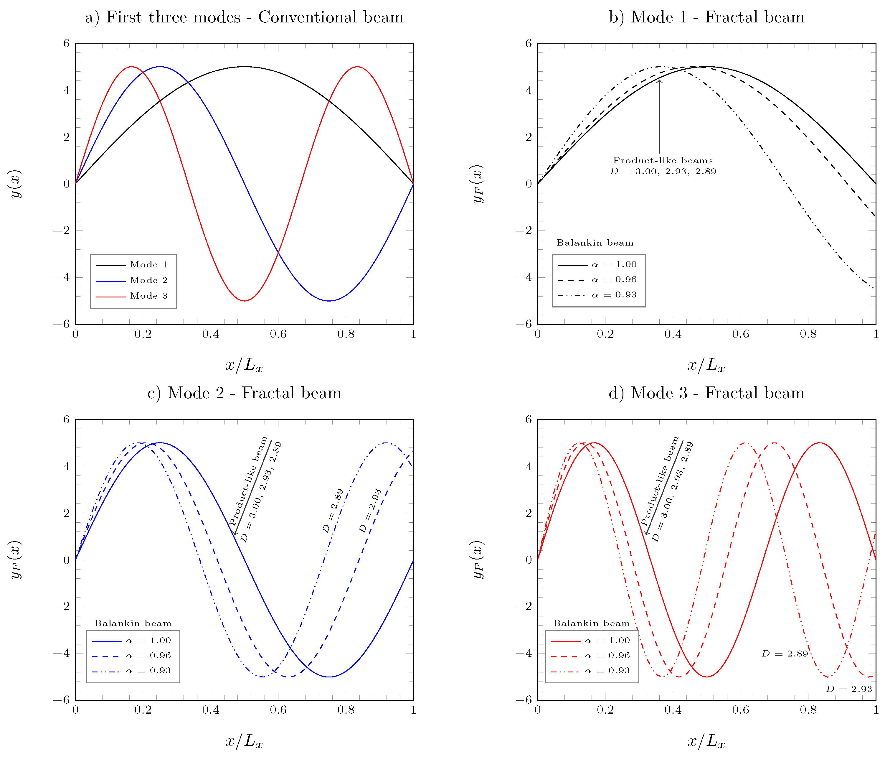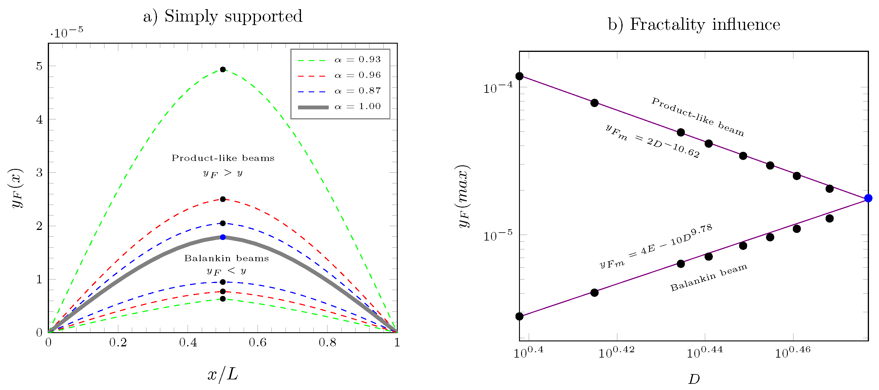 - A comparison between the product-like and Balankin beams under simply supported boundary conditions revealed contrasting behaviors. The Balankin beam exhibited lower static deflections and higher bending stiffness compared to the classical Timoshenko beam, with stiffness decreasing as the box-counting dimension D decreases. In contrast, the product-like beam displayed higher static deflections, and its bending stiffness increased as the box-counting dimension D increased.