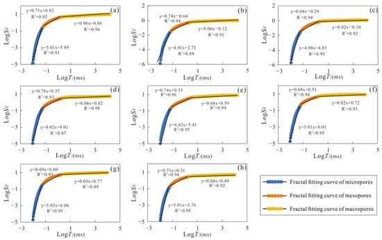 In this formula, refers to the transverse relaxation time of the sample (ms). represents the cumulative fraction of PV with less than or equal to a given value. The data are segmented and fitted in double-logarithmic coordinates versus to determine the fitting range for different pore-size intervals. Linear regression is then performed on each segment using the least squares method, and the coefficient of determination (R2) is calculated to retain the most reliable fits. Finally, the D for each PSD interval is obtained directly from the slope of the corresponding fitted line.