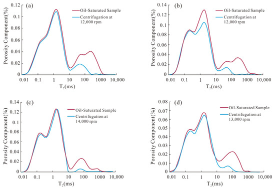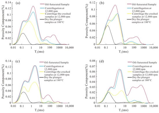 NMR T2 spectrum of plunger sample at optimal centrifugation speed. (a) PL10-2, (b) PL10-4, (c) G1-1, (d) G1-2.