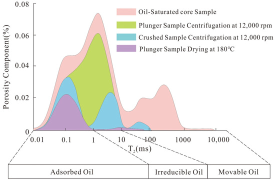 The shale samples in a saturated oil state simulate the development of fluids within the shale under original formation conditions. The broad T2 curve indicates the presence of various fluid types within the pores (Figure 4). After treatment at the optimal centrifuge speed of 12,000 rpm, the area of the third peak in the T2 spectrum significantly decreases, indicating the expulsion of movable oil stored in larger pores or microfractures. Subsequently, when parallel crushed samples were also treated at the optimal centrifuge speed of 12,000 rpm (Figure 4), the third peak in the T2 curve disappears, and the second peak significantly decreases, indicating that shale oil stored in mesopores, micropores, or residual larger pores has been expelled. Finally, the samples that have undergone centrifugation are dried at 180 °C, completely removing the movable fluids from the shale samples, leaving behind the non-movable adsorbed shale oil.