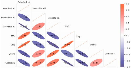 Correlation coefficient matrix of TOC, minerals, and different shale oil occurrence state.
