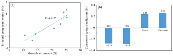 In addition, principal component analysis (PCA) was employed in this study, using clay, carbonate mineral, quartz, and TOC as input variables. Principal component scores were calculated for different samples, and the component exhibiting a strong correlation with movable oil was selected (Figure 8a), from which the corresponding component score coefficients were obtained (Figure 8b). The results indicate that high carbonate and quartz contents are favorable for the movable-oil enrichment, whereas high TOC and high clay mineral contents exert a negative influence.