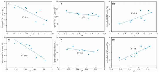 Correlation diagram between shale oil occurrence state and fractal dimension. (a) adsorbed oil, (b) irreducible oil, (c) movable oil content with D2. (d) adsorbed oil, (e) irreducible oil, (f) movable oil content and D2.