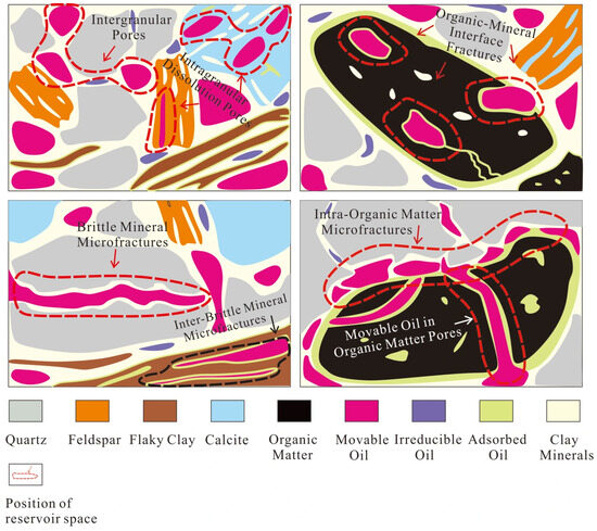 The internal structure of shale governs the storage state and migration efficiency of hydrocarbon, directly affecting the distribution patterns and recoverability. This study constructs a model for the storage state in lacustrine shale oil based on a systematic analysis of the OM geochemical characteristics, microscopic structure, and oil storage types of the Da’anzhai Member (Figure 10). This model systematically reveals how the microscopic pore features of lacustrine shale reservoirs affect various storage states of shale oil, providing theoretical support and guidance for evaluating the resource potential and efficient exploitation of shale oil. As previously mentioned, movable shale oil primarily exists as spherical droplets within pores and micro-fractures larger than 350 nm. The types of pores hosting movable oil mainly include intergranular and intragranular pores associated with brittle minerals, as well as dissolution pores within feldspar or calcite and other inorganic pores. These inorganic pores are well-connected and widely distributed, particularly common in interbedded and thinly layered shale formations. The micro-fractures hosting movable oil exhibit two primary characteristics. The first type is formed by the fracturing of brittle minerals or other dissolution processes. These fractures not only provide pathways for shale oil migration but also serve as major reservoir spaces for hydrocarbon. The second type is OM-related fractures, formed during the thermal evolution of kerogen into oil, where organic matter undergoes significant expansion and contraction, creating organic pores and associated micro-fractures. Additionally, the interface between organic matter and adjacent minerals can form shrinkage fractures, which can be filled with substantial amounts of shale oil. Shale oil located within these pore-fracture configurations exhibits high flow capabilities. For example, some samples contain numerous micro-fractures, resulting in a significantly higher content of movable oil compared to other samples.