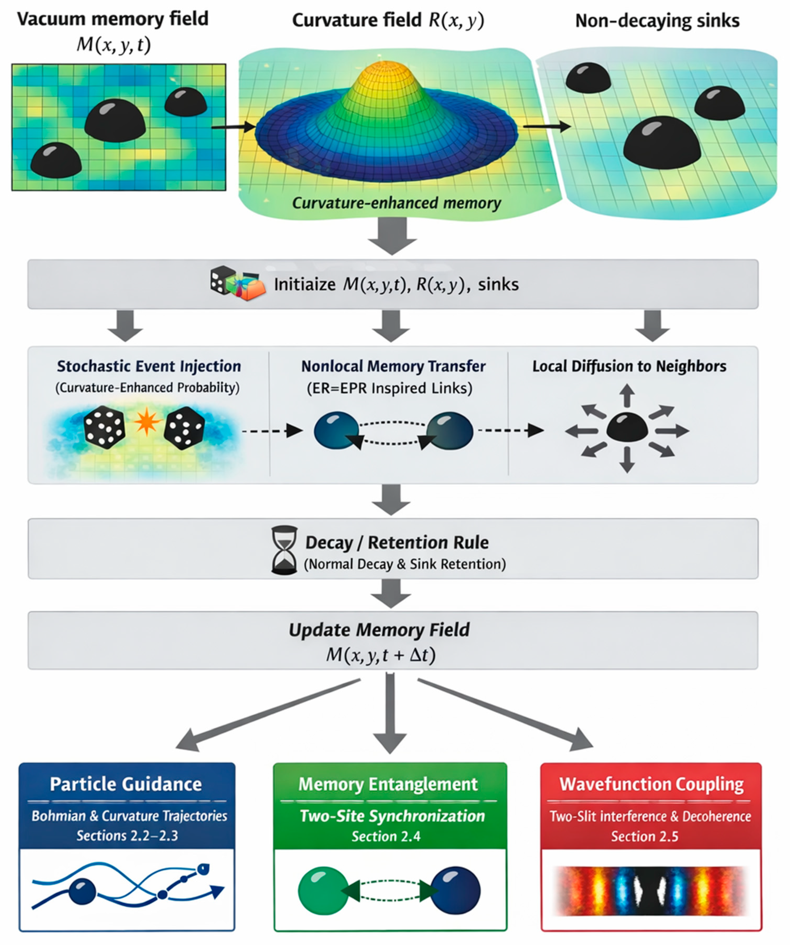 Key features such as black-hole-like sinks and memory entanglement are phenomenological inputs implemented algorithmically, rather than emergent consequences of a fundamental Lagrangian or first-principles field theory.