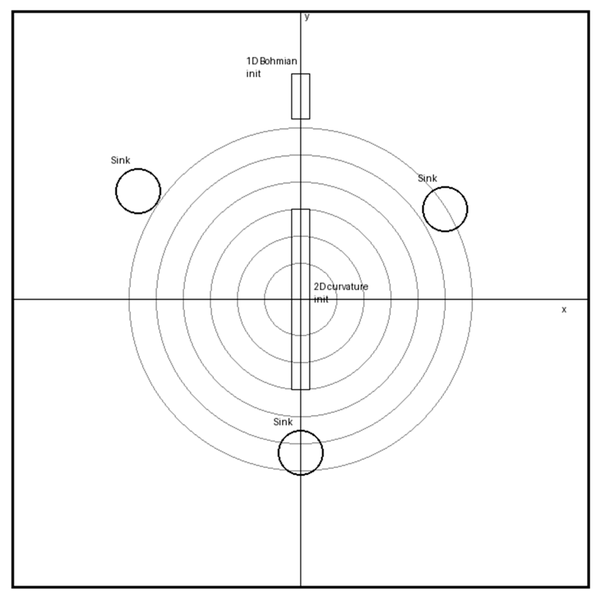 The spatial geometry of the simulation domain, including the curvature well, memory-retaining sink regions, and particle initialization zones, is illustrated schematically in