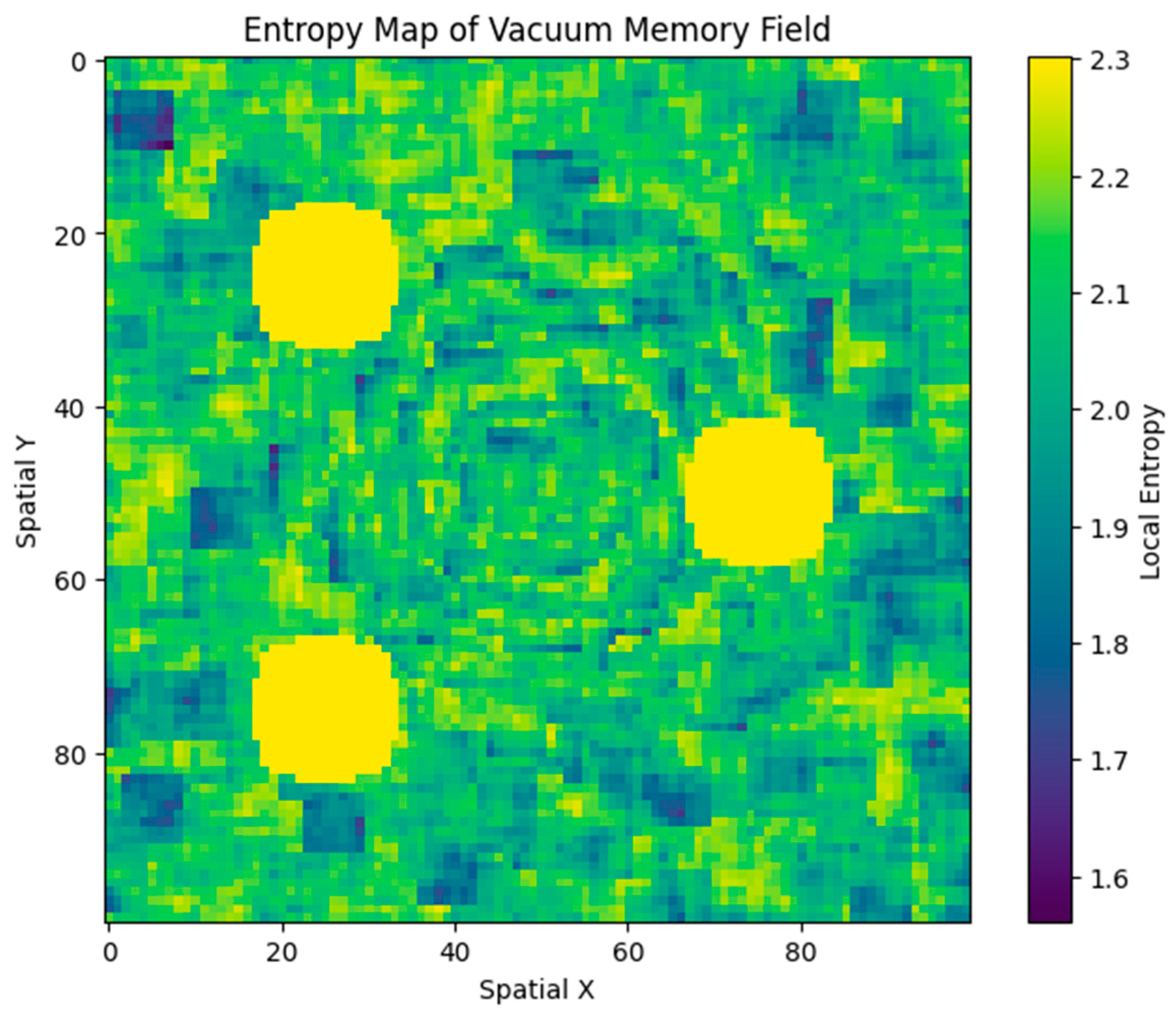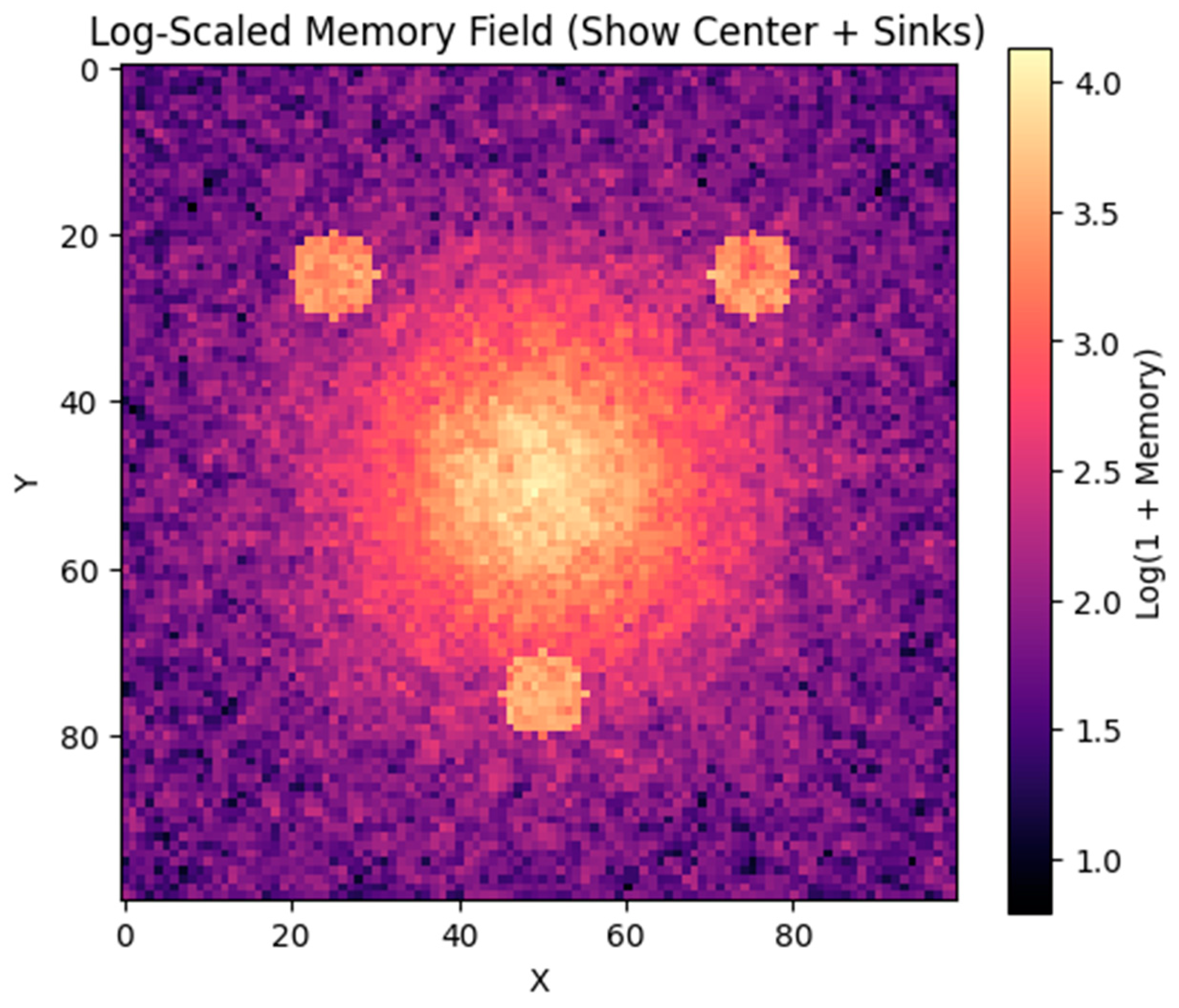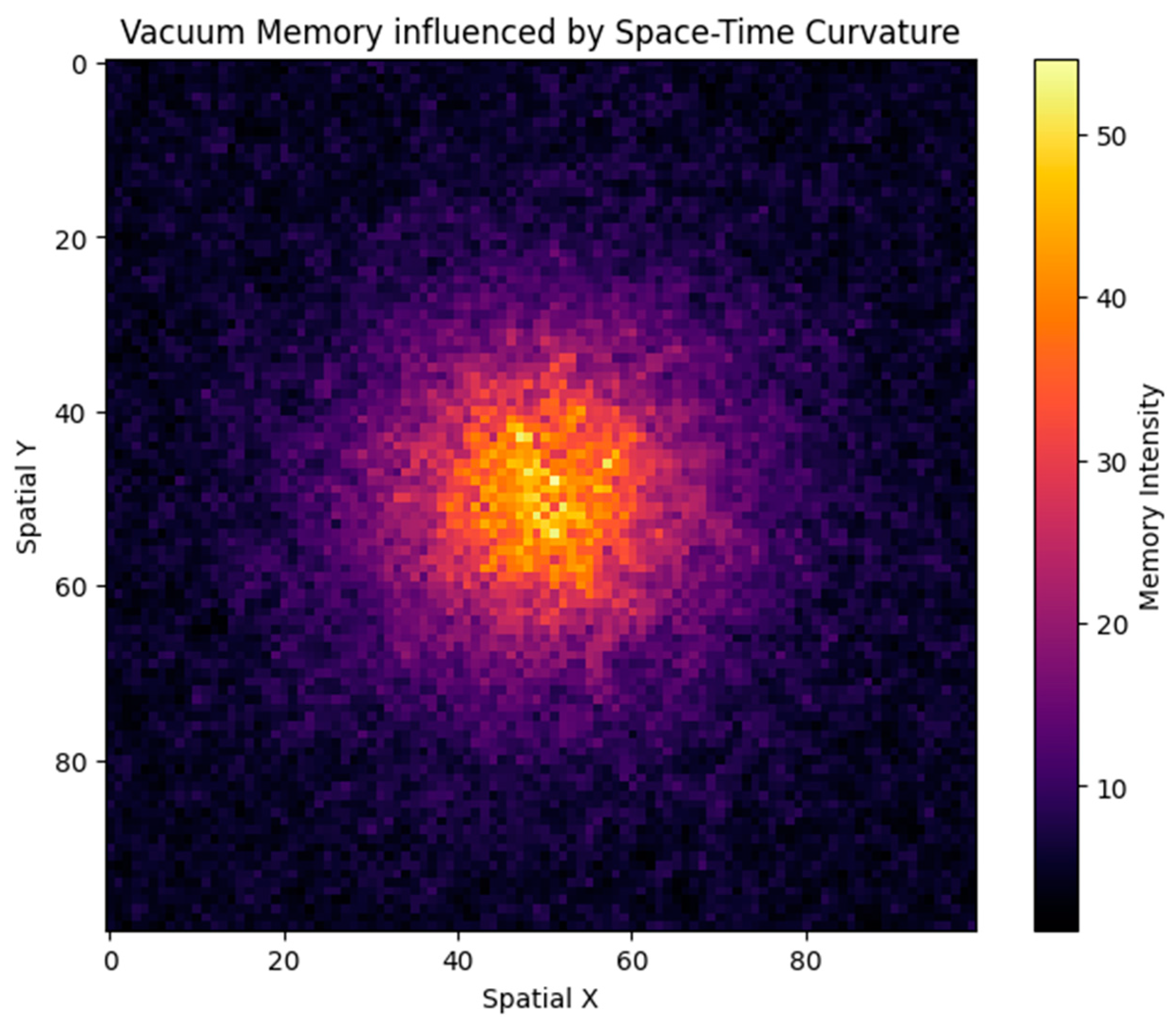 We constructed a discrete, time-evolving simulation on a 100 × 100 spatial grid to explore how structured memory could emerge within a simplified quantum vacuum setting. Each cell in the grid stores a scalar memory value, initially zero, and is updated at each time step according to the following rules: