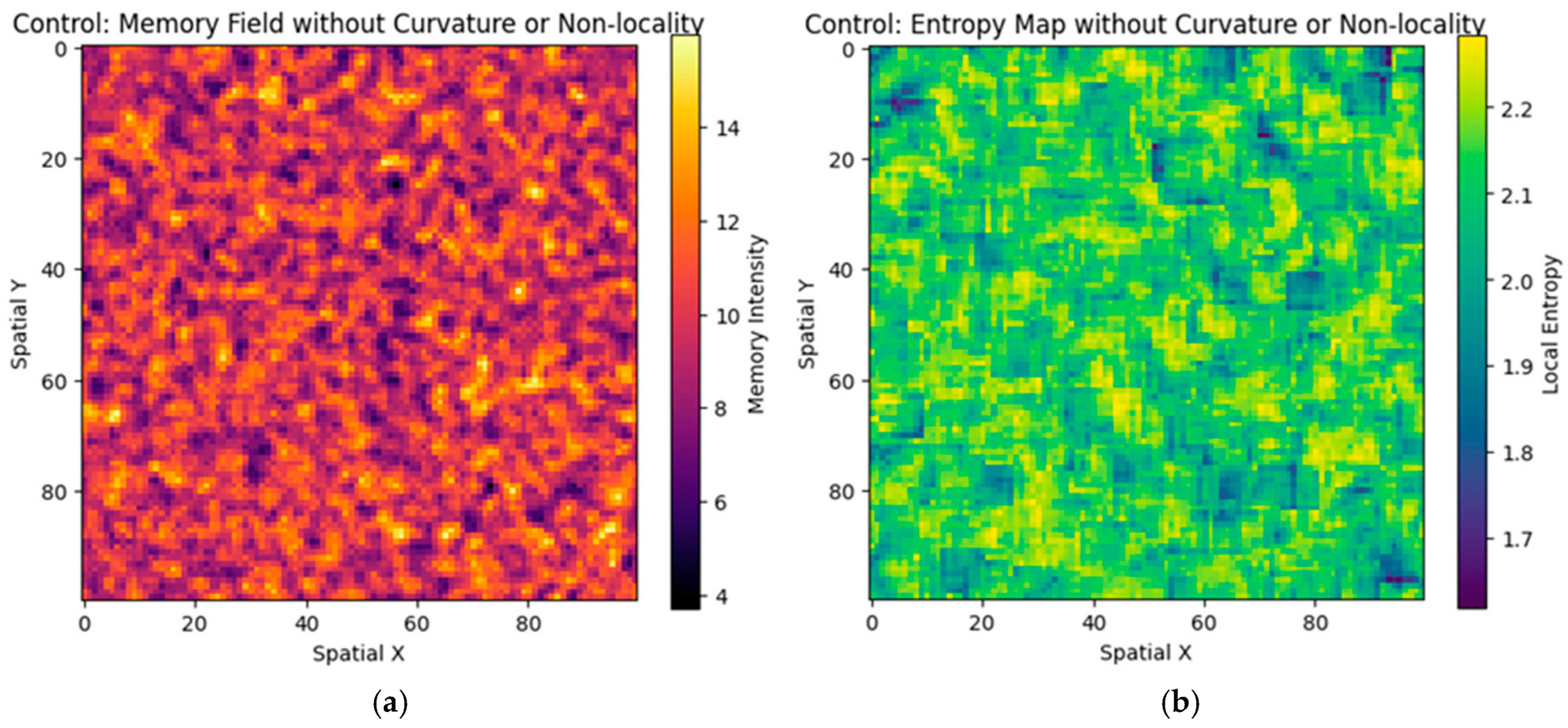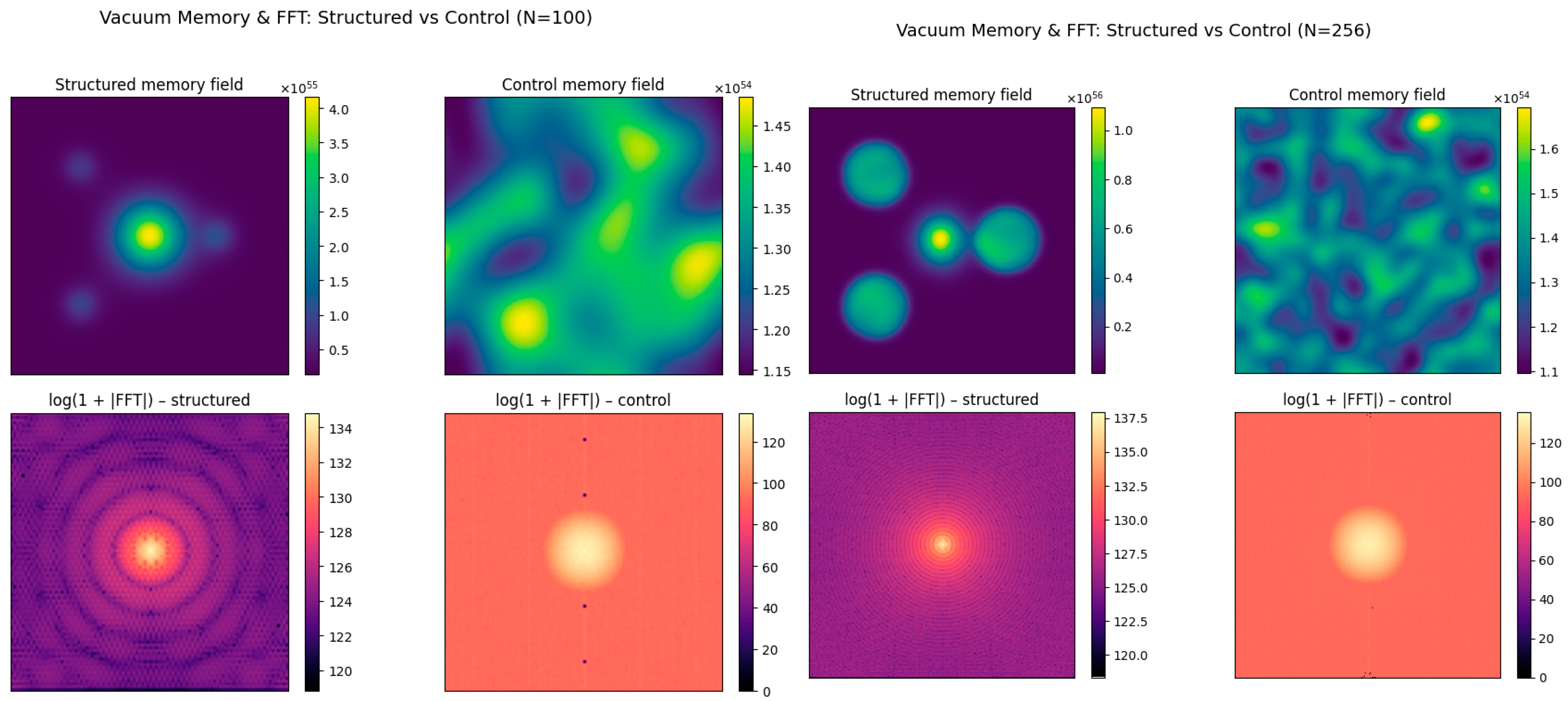 The Fourier analysis extends this insight into the frequency domain. The structured simulation reveals distinct spectral peaks and directional coherence, confirming the presence of large-scale memory patterns. In contrast, the control simulation’s spectrum lacks such features, validating the claim that non-locality and curvature are essential for organized memory formation.