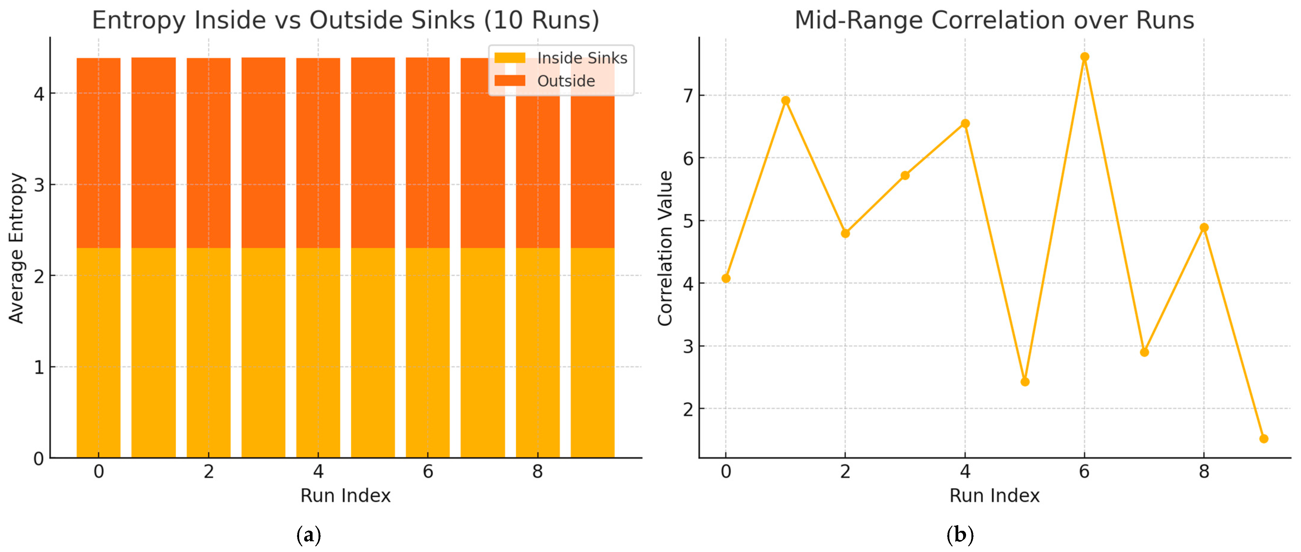 The entropy results highlight a subtle but essential point: regions of high information storage are not necessarily low-entropy. Rather, they contain rich, heterogeneous memory retained from a wide range of events. In this way, our black-hole-like sinks behave analogously to black holes as high-entropy information reservoirs, though the model does not reproduce the Bekenstein–Hawking area-law scaling and should not be interpreted as a microscopic description of black-hole thermodynamics.