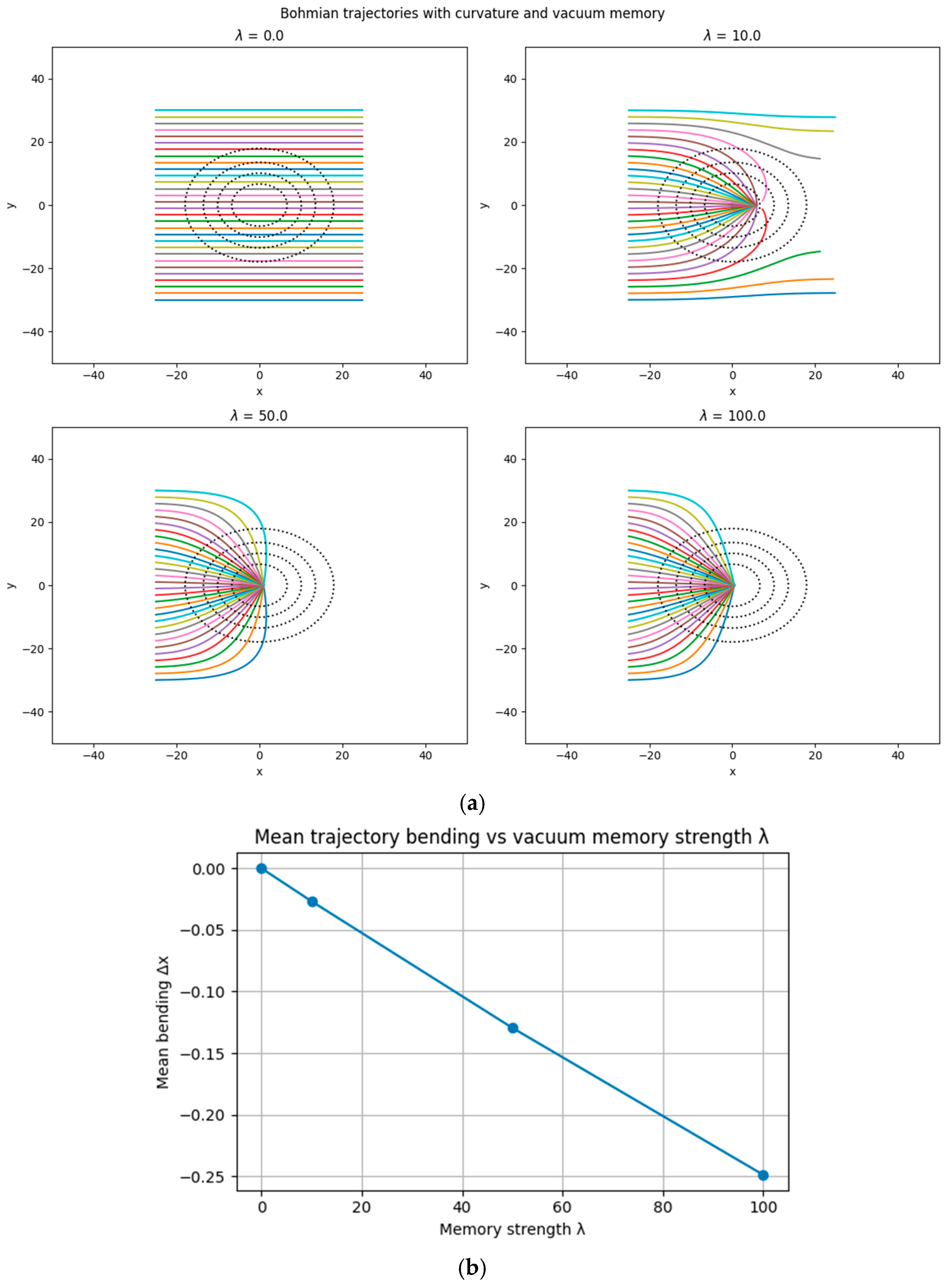 Furthermore, we demonstrated that vacuum memory fields, when modulated by curvature gradients, can dynamically influence the paths of quantum particles. As the memory coupling strength λ increases, particles exhibit progressively stronger convergence toward regions of higher curvature—effectively simulating information-based lensing or focusing.