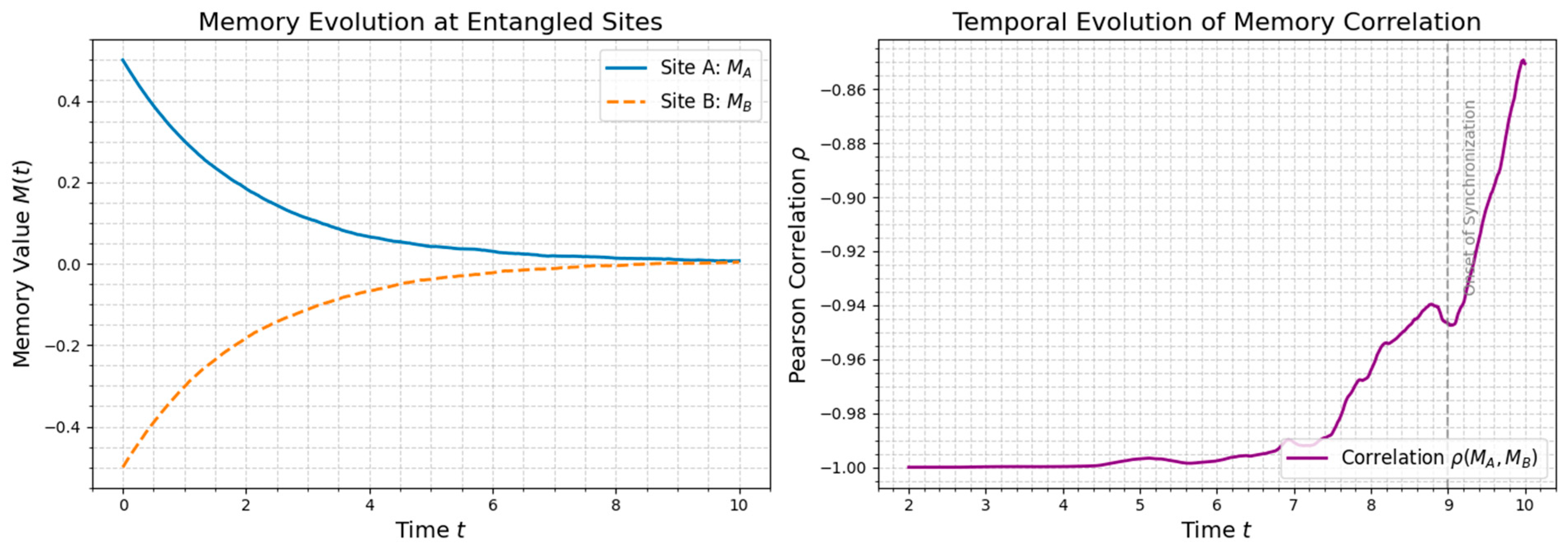 Despite being independently driven by stochastic fluctuations, the coupled memory fields naturally evolve toward a highly correlated state. The observed increase in Pearson correlation over time, even under random noise, demonstrates that minimal nonlocal coupling is sufficient to synchronize distant regions of memory.