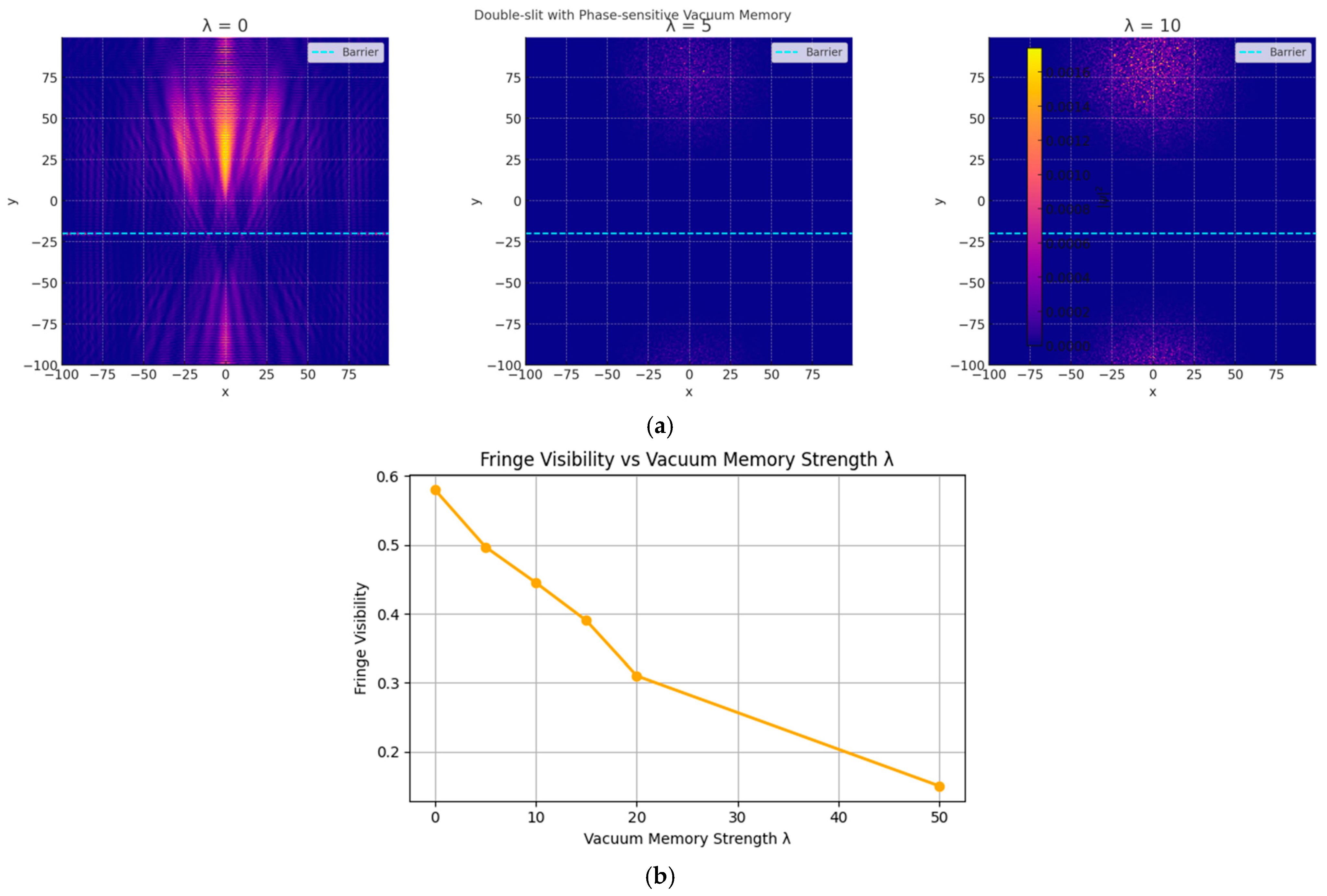 Our next simulation explored the dynamical effect of vacuum memory on quantum interference, using a double-slit configuration. Remarkably, we found that a weak, random vacuum memory field (with no phase sensitivity) preserves the interference fringes with only minor distortion, suggesting that generic fluctuations in memory do not inherently disrupt quantum coherence. However, when the memory field is endowed with phase sensitivity—i.e., it records and responds to the local quantum phase—the interference pattern collapses. Increasing the memory coupling strength λ leads to a progressive suppression of fringe contrast, with full collapse at large λ. This effect mimics decoherence: the vacuum memory acts as an informational environment that entangles with and disrupts phase relations in the wavefunction. Importantly, this occurs in a closed, deterministic model, without external observers or measurement, suggesting that informational backaction from vacuum memory could emulate quantum measurement collapse. This raises the intriguing possibility that wavefunction decoherence or localization may emerge intrinsically from structured, phase-aware vacuum memory rather than from external noise or measurement.