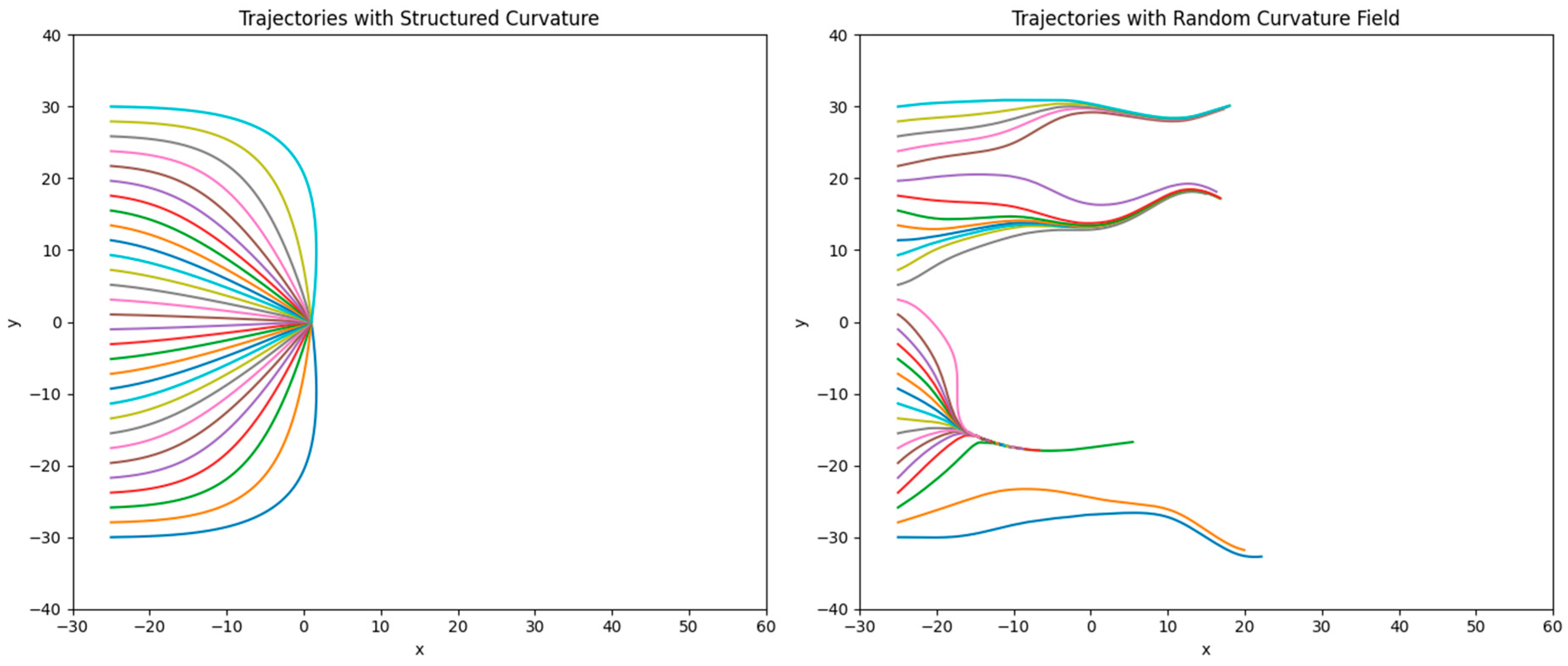 Appendix C. Because the aim of this experiment is to quantify the qualitative dependence of trajectory bending on the memory–curvature coupling λ over a modest number of time steps, a first-order Euler update is adequate to resolve the trend. For more demanding applications—such as long-time evolution in complex curvature landscapes—higher-order schemes (e.g., Runge–Kutta) or symplectic integrators would be required to further control numerical drift in the particle trajectories.