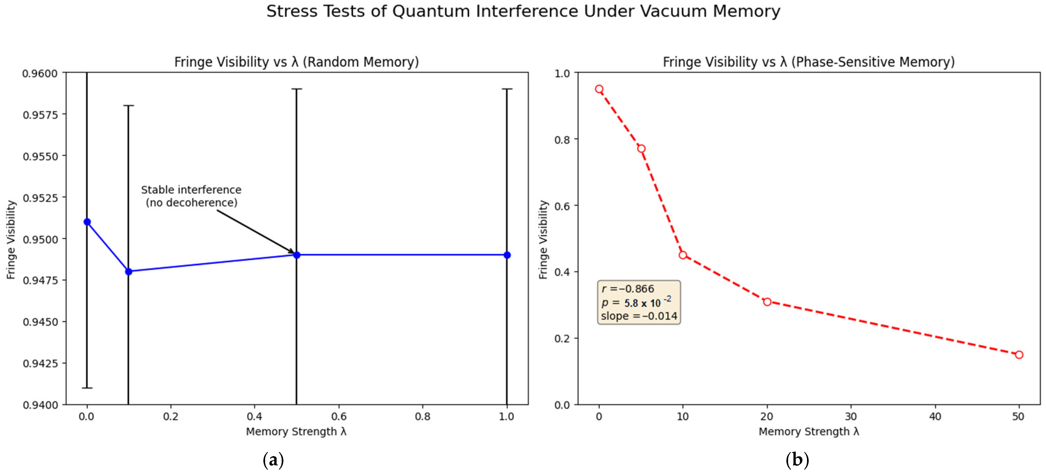 Statistical stress tests of fringe visibility in the two-slit experiment under random and phase-sensitive memory coupling.