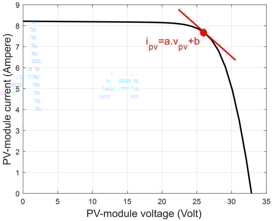 The synthesis phase of the controller appears to require linearization, especially when the PV-module is operating under nominal conditions, optimizing power extraction. This essential criterion is often specified in standard test conditions (STC). Hence, the parabolic shape of the nonlinear ( i p v v p v ) curve can be transformed into a linear form represented by the equation i p v = a × v p v + b at MPP (refer to Figure 2) [28].