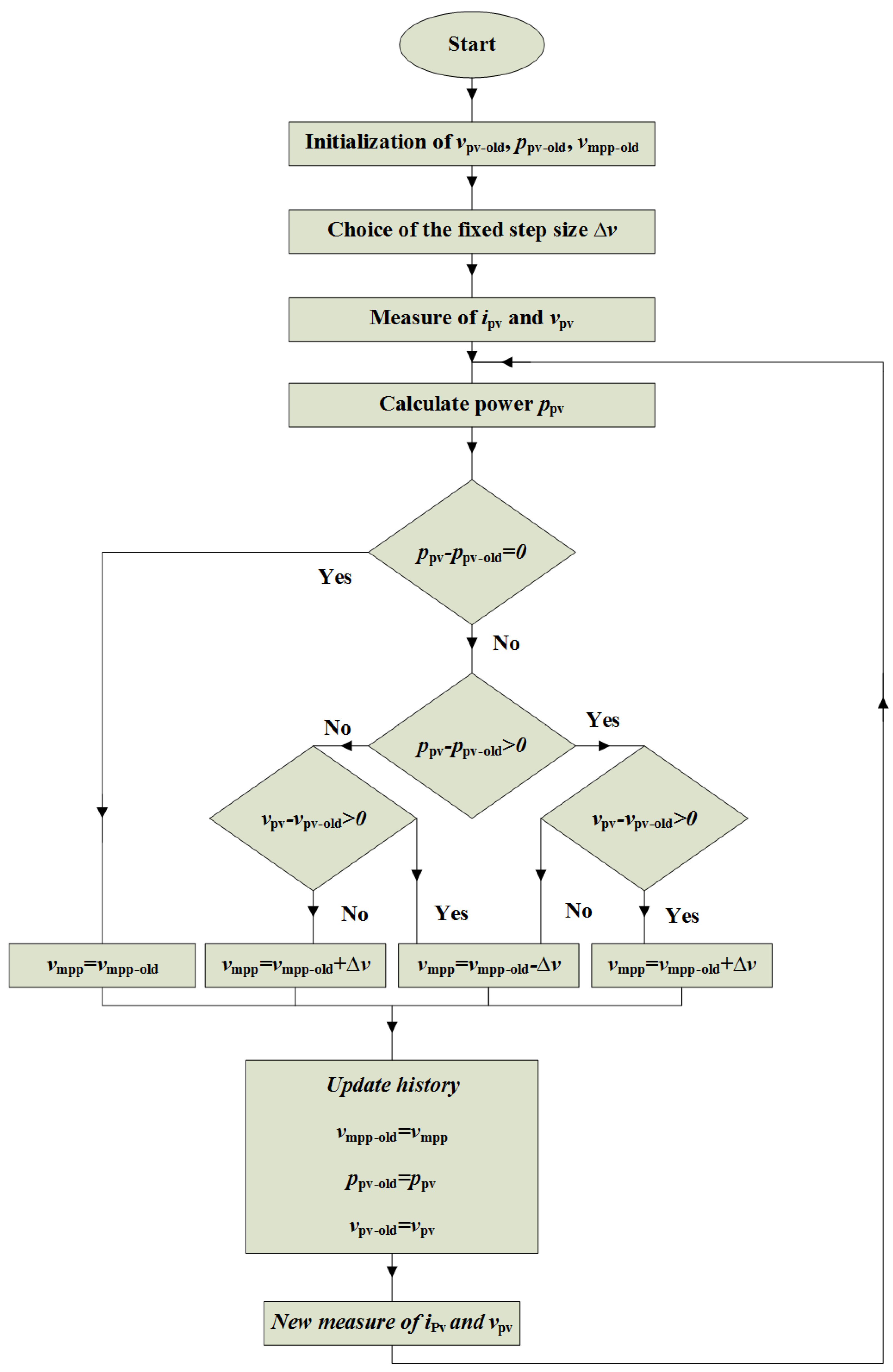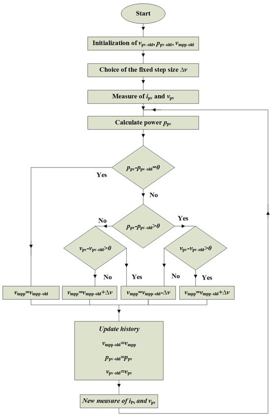 Figure 4. Flowchart of the P&O algorithm used to search for the optimal PV-module voltage in the indirect MPPT approach.